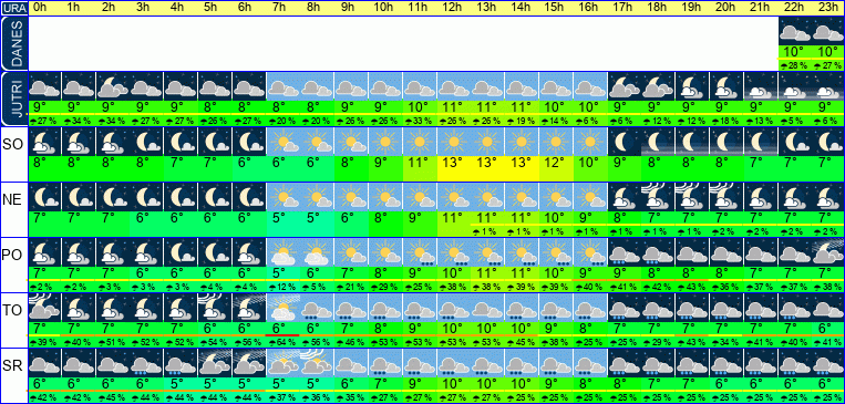 | Temperatura: | 6°C / 7°C / 10°C (+-1°C) | Možnost padavin: | 61 % | Hitrost vetra: | 7 / 11 / 14 km/h (+-7) | Skupna oblačnost: | 51 / 75 / 100 % (+-20) |