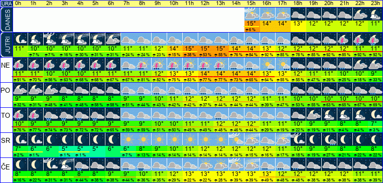 | Ura | 00h | 01h | 02h | 03h | 04h | 05h | 06h | 07h | 08h | 09h | 10h | 11h | 12h | 13h | 14h | 15h | 16h | 17h | 18h | 19h | 20h | 21h | 22h | 23h | |  |  |  |  |  |  |  |  |  |  |  |  |  |  |  |  |  |  |  |  |  |  |  |  | | Temperatura [C°] | 11°C | 11°C | 10°C | 10°C | 10°C | 10°C | 10°C | 11°C | 12°C | 12°C | 14°C | 14°C | 15°C | 15°C | 14°C | 14°C | 13°C | 12°C | 12°C | 12°C | 12°C | 12°C | 11°C | 11°C | | Občutek [C°] | 9°C | 9°C | 8°C | 8°C | 8°C | 8°C | 8°C | 8°C | 9°C | 10°C | 11°C | 12°C | 12°C | 12°C | 11°C | 10°C | 9°C | 9°C | 9°C | 9°C | 8°C | 8°C | 8°C | 8°C | | Možnost padavin | | 7 % | 7 % | 16 % | 30 % | 31 % | 31 % | 24 % | 24 % | 23 % | 15 % | 38 % | 53 % | 55 % | 76 % | 84 % | 91 % | 85 % | 78 % | 85 % | 92 % | 85 % | 92 % | 92 % | | Količina padavin [mm] | | | | | | | | | | | | | | | 1 mm | 1 mm | 1 mm | 1 mm | 1 mm | 1 mm | 1 mm | 1 mm | 3 mm | 3 mm | Sneg [cm] | | | | | | | | | | | | | | | | | | | | | | | | | | UV index | | | | | | | | | | | UV 1 | UV 1 | UV 1 | | | | | | | | | | | | | Hitrost vetra | 7 km/h | 8 km/h | 9 km/h | 9 km/h | 10 km/h | 11 km/h | 12 km/h | 12 km/h | 12 km/h | 11 km/h | 11 km/h | 11 km/h | 12 km/h | 13 km/h | 14 km/h | 16 km/h | 17 km/h | 17 km/h | 15 km/h | 14 km/h | 15 km/h | 17 km/h | 17 km/h | 17 km/h | Smer vetra | V | V | V | V | V | V | V | V | V | V | V | J | J | J | V | V | V | V | V | V | V | V | V | V | | Zračni tlak | 999 | 1000 | 1000 | 1001 | 1001 | 1001 | 1001 | 1001 | 1001 | 1001 | 1002 | 1001 | 1001 | 1000 | 1000 | 1000 | 1000 | 999 | 999 | 998 | 998 | 997 | 997 | 997 | | Vlaga | 82 % | 85 % | 89 % | 91 % | 91 % | 90 % | 89 % | 88 % | 85 % | 80 % | 75 % | 71 % | 68 % | 67 % | 70 % | 73 % | 76 % | 78 % | 80 % | 80 % | 81 % | 81 % | 81 % | 82 % |