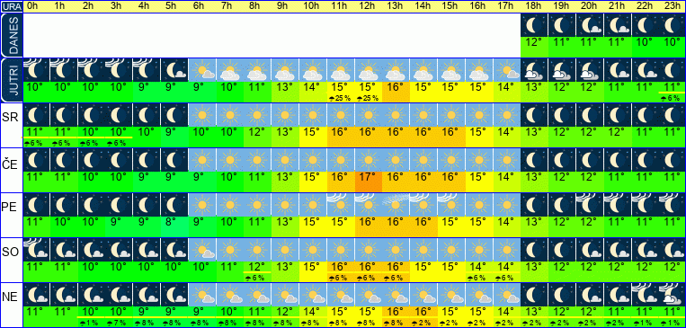 | Ura | 00h | 01h | 02h | 03h | 04h | 05h | 06h | 07h | 08h | 09h | 10h | 11h | 12h | 13h | 14h | 15h | 16h | 17h | 18h | 19h | 20h | 21h | 22h | 23h | |  |  |  |  |  |  |  |  |  |  |  |  |  |  |  |  |  |  |  |  |  |  |  |  | | Temperatura [C°] | 11°C | 11°C | 10°C | 10°C | 10°C | 10°C | 10°C | 11°C | 12°C | 13°C | 15°C | 16°C | 16°C | 16°C | 15°C | 15°C | 14°C | 14°C | 13°C | 12°C | 12°C | 12°C | 12°C | 12°C | | Občutek [C°] | 9°C | 9°C | 9°C | 8°C | 8°C | 8°C | 8°C | 9°C | 10°C | 12°C | 13°C | 14°C | 14°C | 14°C | 14°C | 13°C | 13°C | 13°C | 12°C | 11°C | 11°C | 11°C | 11°C | 10°C | | Možnost padavin | | | | | | | | | 6 % | | | 6 % | 6 % | 6 % | | | 6 % | 6 % | | | | | | | | Količina padavin [mm] | | | | | | | | | | | | | | | | | | | | | | | | | Sneg [cm] | | | | | | | | | | | | | | | | | | | | | | | | | | UV index | | | | | | | | | | | UV 1 | UV 2 | UV 3 | UV 3 | UV 2 | UV 2 | UV 1 | | | | | | | | | Hitrost vetra | 5 km/h | 5 km/h | 5 km/h | 5 km/h | 5 km/h | 5 km/h | 5 km/h | 5 km/h | 5 km/h | 4 km/h | 4 km/h | 5 km/h | 6 km/h | 7 km/h | 7 km/h | 6 km/h | 6 km/h | 5 km/h | 4 km/h | 3 km/h | 3 km/h | 3 km/h | 3 km/h | 4 km/h | Smer vetra | V | V | V | V | S | V | V | V | S | V | J | J | Z | J | Z | Z | Z | Z | Z | S | S | V | V | V | | Zračni tlak | 1025 | 1025 | 1025 | 1024 | 1024 | 1024 | 1024 | 1025 | 1025 | 1025 | 1025 | 1024 | 1024 | 1023 | 1023 | 1023 | 1023 | 1023 | 1023 | 1023 | 1023 | 1024 | 1024 | 1024 | | Vlaga | 71 % | 73 % | 74 % | 75 % | 76 % | 77 % | 78 % | 76 % | 73 % | 68 % | 66 % | 64 % | 65 % | 65 % | 65 % | 67 % | 70 % | 73 % | 77 % | 77 % | 75 % | 73 % | 73 % | 74 % |