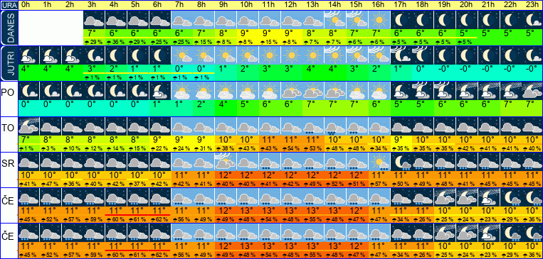 | Ura | 00h | 01h | 02h | 03h | 04h | 05h | 06h | 07h | 08h | 09h | 10h | 11h | 12h | 13h | 14h | 15h | 16h | 17h | 18h | 19h | 20h | 21h | 22h | 23h | |  |  |  |  |  |  |  |  |  |  |  |  |  |  |  |  |  |  |  |  |  |  |  |  | | Temperatura [C°] | 10°C | 11°C | 11°C | 11°C | 10°C | 10°C | 10°C | 10°C | 11°C | 11°C | 12°C | 12°C | 12°C | 12°C | 12°C | 11°C | 11°C | 11°C | 11°C | 11°C | 11°C | 11°C | 11°C | 11°C | | Občutek [C°] | 8°C | 8°C | 8°C | 8°C | 7°C | 7°C | 7°C | 7°C | 8°C | 8°C | 9°C | 9°C | 9°C | 9°C | 9°C | 8°C | 8°C | 8°C | 8°C | 8°C | 8°C | 8°C | 8°C | 8°C | | Možnost padavin | 51 % | 56 % | 48 % | 47 % | 47 % | 41 % | 42 % | 41 % | 36 % | 38 % | 40 % | 41 % | 54 % | 61 % | 68 % | 67 % | 72 % | 67 % | 60 % | 60 % | 61 % | 62 % | 69 % | 69 % | | Količina padavin [mm] | | | | | | | | | | | | | | | 1 mm | 1 mm | 1 mm | 1 mm | 1 mm | 1 mm | 1 mm | 1 mm | 1 mm | 1 mm | Sneg [cm] | | | | | | | | | | | | | | | | | | | | | | | | | | UV index | | | | | | | | | | | | | | UV 1 | | | | | | | | | | | | Hitrost vetra | 10 km/h | 10 km/h | 11 km/h | 11 km/h | 11 km/h | 11 km/h | 11 km/h | 12 km/h | 12 km/h | 12 km/h | 12 km/h | 12 km/h | 12 km/h | 12 km/h | 12 km/h | 12 km/h | 11 km/h | 11 km/h | 11 km/h | 11 km/h | 11 km/h | 11 km/h | 11 km/h | 11 km/h | Smer vetra | J | J | J | J | J | J | J | J | J | J | J | J | J | J | J | J | J | J | J | J | J | J | J | J | | Zračni tlak | 1023 | 1023 | 1023 | 1022 | 1022 | 1022 | 1022 | 1022 | 1022 | 1022 | 1022 | 1022 | 1021 | 1021 | 1021 | 1020 | 1020 | 1020 | 1020 | 1020 | 1020 | 1020 | 1020 | 1020 | | Vlaga | 77 % | 76 % | 76 % | 77 % | 78 % | 80 % | 80 % | 79 % | 77 % | 73 % | 71 % | 70 % | 70 % | 71 % | 73 % | 76 % | 78 % | 80 % | 80 % | 81 % | 82 % | 82 % | 82 % | 81 % |