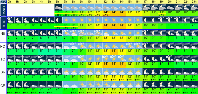 | Ura | 06h | 07h | 08h | 09h | 10h | 11h | 12h | 13h | 14h | 15h | 16h | 17h | 18h | 19h | 20h | 21h | 22h | 23h | | | | | | | |  |  |  |  |  |  |  |  |  |  |  |  |  |  |  |  |  |  | | Temperatura [C°] | 8°C | 9°C | 10°C | 11°C | 12°C | 13°C | 14°C | 14°C | 14°C | 13°C | 13°C | 12°C | 11°C | 11°C | 10°C | 10°C | 10°C | 10°C | | Občutek [C°] | 6°C | 7°C | 8°C | 10°C | 11°C | 12°C | 13°C | 13°C | 13°C | 10°C | 10°C | 9°C | 8°C | 7°C | 7°C | 7°C | 6°C | 6°C | | Možnost padavin | 11 % | 11 % | 11 % | 6 % | 6 % | 6 % | 6 % | | | | | | | 6 % | | | | | | Količina padavin [mm] | | | | | | | | | | | | | | | | | | | Sneg [cm] | | | | | | | | | | | | | | | | | | | | UV index | | | | | | UV 1 | UV 1 | UV 1 | UV 1 | | | | | | | | | | | Hitrost vetra | 6 km/h | 6 km/h | 7 km/h | 4 km/h | 5 km/h | 4 km/h | 3 km/h | 2 km/h | 6 km/h | 12 km/h | 10 km/h | 10 km/h | 12 km/h | 12 km/h | 11 km/h | 11 km/h | 11 km/h | 12 km/h | Smer vetra | V | V | V | V | V | V | V | S | S | S | S | S | S | S | S | S | S | S | | Zračni tlak | 1006 | 1006 | 1006 | 1006 | 1007 | 1007 | 1006 | 1006 | 1006 | 1007 | 1007 | 1007 | 1008 | 1008 | 1008 | 1009 | 1009 | 1009 | | Vlaga | 87 % | 83 % | 80 % | 79 % | 78 % | 78 % | 78 % | 76 % | 75 % | 71 % | 76 % | 75 % | 70 % | 70 % | 69 % | 69 % | 69 % | 70 % |