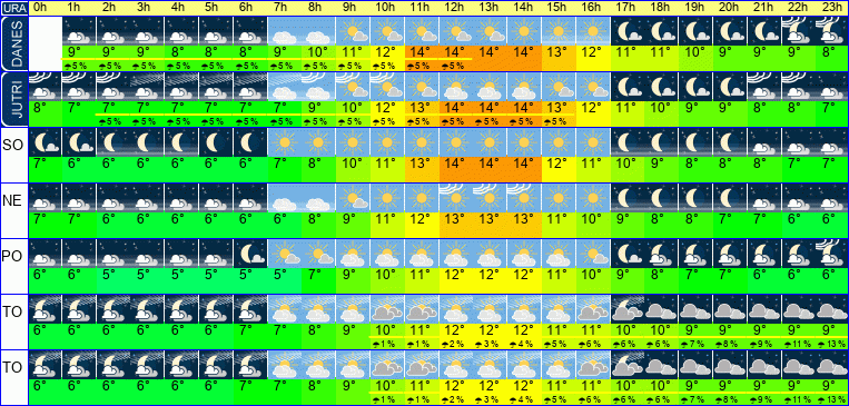 | Ura | 00h | 01h | 02h | 03h | 04h | 05h | 06h | 07h | 08h | 09h | 10h | 11h | 12h | 13h | 14h | 15h | 16h | 17h | 18h | 19h | 20h | 21h | 22h | 23h | |  |  |  |  |  |  |  |  |  |  |  |  |  |  |  |  |  |  |  |  |  |  |  |  | | Temperatura [C°] | 7°C | 6°C | 6°C | 6°C | 6°C | 6°C | 6°C | 7°C | 8°C | 10°C | 11°C | 13°C | 14°C | 14°C | 14°C | 12°C | 11°C | 10°C | 9°C | 8°C | 8°C | 8°C | 7°C | 7°C | | Občutek [C°] | 4°C | 4°C | 4°C | 3°C | 3°C | 3°C | 3°C | 4°C | 5°C | 8°C | 10°C | 11°C | 12°C | 12°C | 11°C | 10°C | 9°C | 8°C | 7°C | 7°C | 6°C | 6°C | 5°C | 5°C | | Možnost padavin | | | | | | | | | | | | | | | | | | | | | | | | | | Količina padavin [mm] | | | | | | | | | | | | | | | | | | | | | | | | | Sneg [cm] | | | | | | | | | | | | | | | | | | | | | | | | | | UV index | | | | | | | | | | | | UV 1 | UV 1 | UV 1 | UV 1 | UV 1 | | | | | | | | | | Hitrost vetra | 7 km/h | 6 km/h | 6 km/h | 6 km/h | 6 km/h | 6 km/h | 6 km/h | 5 km/h | 4 km/h | 2 km/h | 1 km/h | 2 km/h | 4 km/h | 5 km/h | 6 km/h | 6 km/h | 6 km/h | 5 km/h | 4 km/h | 3 km/h | 3 km/h | 3 km/h | 3 km/h | 3 km/h | Smer vetra | S | S | S | S | S | S | S | S | V | V | S | S | S | Z | Z | Z | S | S | S | S | S | V | V | V | | Zračni tlak | 1024 | 1024 | 1024 | 1024 | 1024 | 1024 | 1024 | 1024 | 1025 | 1025 | 1025 | 1025 | 1025 | 1024 | 1024 | 1024 | 1024 | 1024 | 1025 | 1025 | 1025 | 1025 | 1025 | 1025 | | Vlaga | 87 % | 85 % | 82 % | 81 % | 80 % | 78 % | 76 % | 72 % | 69 % | 69 % | 69 % | 63 % | 56 % | 55 % | 55 % | 66 % | 76 % | 82 % | 86 % | 87 % | 87 % | 85 % | 84 % | 83 % |