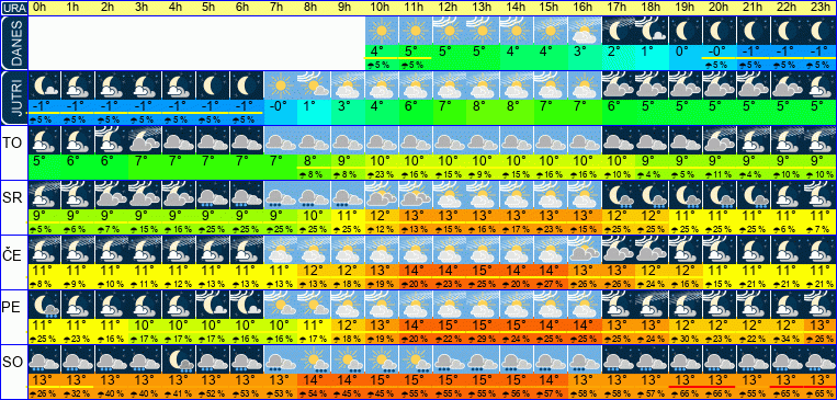 | Ura | 00h | 01h | 02h | 03h | 04h | 05h | 06h | 07h | 08h | 09h | 10h | 11h | 12h | 13h | 14h | 15h | 16h | 17h | 18h | 19h | 20h | 21h | 22h | 23h | |  |  |  |  |  |  |  |  |  |  |  |  |  |  |  |  |  |  |  |  |  |  |  |  | | Temperatura [C°] | -1°C | -2°C | -2°C | -1°C | -1°C | -1°C | -1°C | -0°C | 1°C | 3°C | 4°C | 6°C | 7°C | 7°C | 7°C | 7°C | 7°C | 6°C | 5°C | 5°C | 5°C | 5°C | 5°C | 5°C | | Občutek [C°] | -5°C | -6°C | -5°C | -6°C | -5°C | -5°C | -5°C | -4°C | -3°C | -1°C | 1°C | 2°C | 3°C | 4°C | 3°C | 3°C | 3°C | 2°C | 2°C | 1°C | 1°C | 1°C | 2°C | 2°C | | Možnost padavin | 5 % | 5 % | 5 % | 5 % | 5 % | 5 % | 5 % | | | | | | | | | | | | | | | | | | | Količina padavin [mm] | | | | | | | | | | | | | | | | | | | | | | | | | Sneg [cm] | | | | | | | | | | | | | | | | | | | | | | | | | | UV index | | | | | | | | | | | | UV 1 | UV 1 | UV 1 | UV 1 | UV 1 | | | | | | | | | | Hitrost vetra | 4 km/h | 5 km/h | 3 km/h | 6 km/h | 5 km/h | 5 km/h | 6 km/h | 5 km/h | 5 km/h | 5 km/h | 4 km/h | 5 km/h | 6 km/h | 7 km/h | 8 km/h | 9 km/h | 8 km/h | 6 km/h | 7 km/h | 7 km/h | 7 km/h | 6 km/h | 5 km/h | 5 km/h | Smer vetra | S | S | V | V | V | V | V | V | V | V | V | V | V | V | V | V | V | V | V | V | V | V | V | V | | Zračni tlak | 1025 | 1025 | 1025 | 1025 | 1025 | 1025 | 1025 | 1025 | 1025 | 1026 | 1026 | 1025 | 1025 | 1024 | 1024 | 1024 | 1024 | 1024 | 1024 | 1024 | 1024 | 1024 | 1024 | 1024 | | Vlaga | 59 % | 63 % | 60 % | 67 % | 66 % | 64 % | 65 % | 62 % | 57 % | 53 % | 54 % | 51 % | 50 % | 49 % | 51 % | 54 % | 58 % | 64 % | 69 % | 71 % | 73 % | 74 % | 75 % | 76 % |