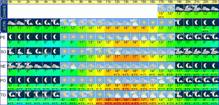 | Ura | 00h | 01h | 02h | 03h | 04h | 05h | 06h | 07h | 08h | 09h | 10h | 11h | 12h | 13h | 14h | 15h | 16h | 17h | 18h | 19h | 20h | 21h | 22h | 23h | |  |  |  |  |  |  |  |  |  |  |  |  |  |  |  |  |  |  |  |  |  |  |  |  | | Temperatura [C°] | 8°C | 7°C | 7°C | 7°C | 7°C | 7°C | 7°C | 8°C | 9°C | 11°C | 13°C | 14°C | 15°C | 15°C | 15°C | 14°C | 13°C | 12°C | 11°C | 11°C | 10°C | 10°C | 9°C | 9°C | | Občutek [C°] | 6°C | 5°C | 5°C | 5°C | 5°C | 5°C | 5°C | 6°C | 7°C | 9°C | 11°C | 12°C | 12°C | 12°C | 12°C | 12°C | 11°C | 11°C | 10°C | 9°C | 9°C | 8°C | 8°C | 8°C | | Možnost padavin | | | | | | | | 5 % | 6 % | 6 % | 6 % | 6 % | 7 % | 2 % | 2 % | 2 % | 2 % | 2 % | 3 % | 3 % | 3 % | 3 % | 3 % | 3 % | | Količina padavin [mm] | | | | | | | | | | | | | | | | | | | | | | | | | Sneg [cm] | | | | | | | | | | | | | | | | | | | | | | | | | | UV index | | | | | | | | | | | UV 1 | UV 2 | UV 2 | UV 2 | UV 2 | UV 2 | UV 1 | | | | | | | | | Hitrost vetra | 4 km/h | 4 km/h | 4 km/h | 4 km/h | 3 km/h | 3 km/h | 4 km/h | 4 km/h | 3 km/h | 3 km/h | 5 km/h | 5 km/h | 7 km/h | 11 km/h | 11 km/h | 10 km/h | 8 km/h | 6 km/h | 5 km/h | 6 km/h | 7 km/h | 7 km/h | 6 km/h | 6 km/h | Smer vetra | V | V | V | V | V | V | V | V | V | V | J | J | J | J | Z | Z | Z | Z | J | J | V | V | V | J | | Zračni tlak | 1023 | 1023 | 1022 | 1022 | 1021 | 1021 | 1021 | 1021 | 1021 | 1021 | 1021 | 1021 | 1020 | 1020 | 1020 | 1020 | 1019 | 1020 | 1020 | 1020 | 1021 | 1021 | 1021 | 1021 | | Vlaga | 89 % | 87 % | 86 % | 86 % | 86 % | 85 % | 81 % | 75 % | 68 % | 62 % | 57 % | 56 % | 56 % | 57 % | 60 % | 65 % | 70 % | 78 % | 86 % | 92 % | 96 % | 97 % | 99 % | 98 % |