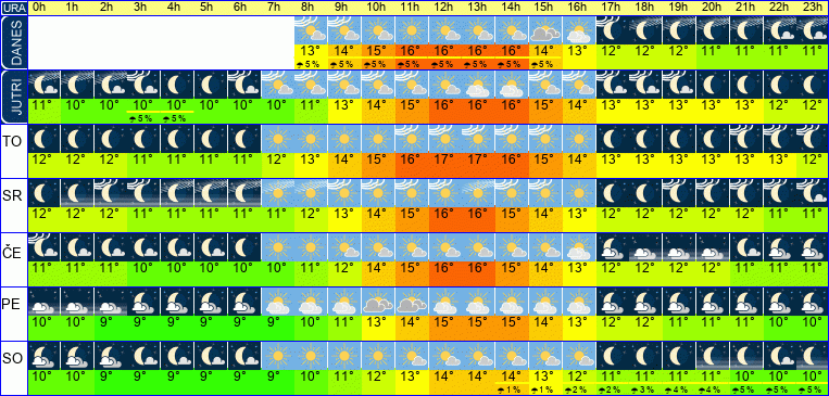 | Ura | 07h | 08h | 09h | 10h | 11h | 12h | 13h | 14h | 15h | 16h | 17h | 18h | 19h | 20h | 21h | 22h | 23h | | | | | | | | |  |  |  |  |  |  |  |  |  |  |  |  |  |  |  |  |  | | Temperatura [C°] | 12°C | 13°C | 14°C | 15°C | 15°C | 16°C | 15°C | 15°C | 14°C | 13°C | 12°C | 12°C | 12°C | 11°C | 11°C | 11°C | 10°C | | Občutek [C°] | 10°C | 10°C | 11°C | 13°C | 13°C | 14°C | 14°C | 14°C | 13°C | 11°C | 9°C | 9°C | 9°C | 8°C | 8°C | 7°C | 7°C | | Možnost padavin | 5 % | 5 % | 5 % | 5 % | 5 % | 5 % | 5 % | 5 % | 5 % | | | | | | | | | | Količina padavin [mm] | | | | | | | | | | | | | | | | | | Sneg [cm] | | | | | | | | | | | | | | | | | | | UV index | | | | | UV 1 | UV 1 | UV 1 | UV 1 | UV 1 | | | | | | | | | | Hitrost vetra | 7 km/h | 7 km/h | 7 km/h | 6 km/h | 5 km/h | 3 km/h | 2 km/h | 1 km/h | 3 km/h | 5 km/h | 9 km/h | 11 km/h | 9 km/h | 10 km/h | 10 km/h | 10 km/h | 10 km/h | Smer vetra | S | S | S | S | S | S | S | S | Z | S | S | S | S | S | S | S | S | | Zračni tlak | 1012 | 1013 | 1013 | 1014 | 1013 | 1013 | 1013 | 1013 | 1013 | 1014 | 1014 | 1014 | 1015 | 1015 | 1016 | 1016 | 1016 | | Vlaga | 63 % | 63 % | 62 % | 59 % | 58 % | 58 % | 59 % | 62 % | 65 % | 67 % | 67 % | 66 % | 66 % | 66 % | 67 % | 67 % | 67 % |