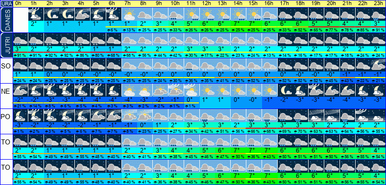 | Ura | 00h | 01h | 02h | 03h | 04h | 05h | 06h | 07h | 08h | 09h | 10h | 11h | 12h | 13h | 14h | 15h | 16h | 17h | 18h | 19h | 20h | 21h | 22h | 23h | |  |  |  |  |  |  |  |  |  |  |  |  |  |  |  |  |  |  |  |  |  |  |  |  | | Temperatura [C°] | 2°C | 2°C | 1°C | 1°C | 1°C | 1°C | 1°C | 1°C | 2°C | 3°C | 4°C | 5°C | 6°C | 6°C | 7°C | 7°C | 6°C | 6°C | 6°C | 5°C | 5°C | 4°C | 4°C | 3°C | | Občutek [C°] | -1°C | -1°C | -2°C | -2°C | -2°C | -2°C | -2°C | -1°C | -0°C | 1°C | 2°C | 3°C | 4°C | 4°C | 4°C | 4°C | 4°C | 3°C | 3°C | 2°C | 1°C | 0°C | -0°C | -1°C | | Možnost padavin | | | | | | | 6 % | 13 % | 25 % | 25 % | 33 % | 26 % | 26 % | 25 % | 25 % | 25 % | 25 % | 33 % | 52 % | 65 % | 77 % | 78 % | 85 % | 91 % | | Količina padavin [mm] | | | | | | | | | | | | 1 mm | 1 mm | | | | 1 mm | 1 mm | 1 mm | | 1 mm | 1 mm | 2 mm | 3 mm | Sneg [cm] | | | | | | | | | | | | | | | | | | | | | | | | | | UV index | | | | | | | | | | | | UV 1 | UV 1 | UV 1 | UV 1 | UV 1 | | | | | | | | | | Hitrost vetra | 5 km/h | 4 km/h | 4 km/h | 4 km/h | 3 km/h | 3 km/h | 3 km/h | 3 km/h | 3 km/h | 4 km/h | 4 km/h | 5 km/h | 6 km/h | 5 km/h | 6 km/h | 6 km/h | 6 km/h | 7 km/h | 8 km/h | 9 km/h | 10 km/h | 12 km/h | 12 km/h | 12 km/h | Smer vetra | Z | Z | V | Z | Z | Z | Z | V | S | S | V | S | S | Z | V | V | V | V | V | V | S | S | S | V | | Zračni tlak | 1011 | 1011 | 1010 | 1009 | 1009 | 1009 | 1008 | 1008 | 1008 | 1008 | 1009 | 1008 | 1008 | 1008 | 1008 | 1009 | 1009 | 1009 | 1010 | 1010 | 1010 | 1010 | 1011 | 1011 | | Vlaga | 89 % | 89 % | 89 % | 89 % | 90 % | 90 % | 91 % | 90 % | 89 % | 87 % | 86 % | 85 % | 85 % | 85 % | 86 % | 87 % | 88 % | 89 % | 90 % | 91 % | 91 % | 91 % | 91 % | 92 % |