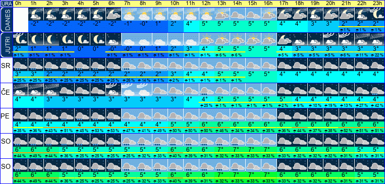| Ura | 00h | 01h | 02h | 03h | 04h | 05h | 06h | 07h | 08h | 09h | 10h | 11h | 12h | 13h | 14h | 15h | 16h | 17h | 18h | 19h | 20h | 21h | 22h | 23h | |  |  |  |  |  |  |  |  |  |  |  |  |  |  |  |  |  |  |  |  |  |  |  |  | | Temperatura [C°] | -2°C | -2°C | -2°C | -2°C | -2°C | -2°C | -2°C | -1°C | -0°C | 1°C | 2°C | 4°C | 5°C | 5°C | 5°C | 5°C | 5°C | 4°C | 4°C | 3°C | 3°C | 2°C | 2°C | 2°C | | Občutek [C°] | -5°C | -5°C | -5°C | -5°C | -5°C | -5°C | -5°C | -4°C | -3°C | -2°C | -0°C | 1°C | 2°C | 3°C | 3°C | 3°C | 2°C | 2°C | 1°C | 1°C | 0°C | 0°C | -0°C | -0°C | | Možnost padavin | | | | | | | | | | | | | | | | | | | | | | 1 % | 1 % | 1 % | | Količina padavin [mm] | | | | | | | | | | | | | | | | | | | | | | | | | Sneg [cm] | | | | | | | | | | | | | | | | | | | | | | | | | | UV index | | | | | | | | | | | | UV 1 | UV 1 | UV 1 | UV 1 | | | | | | | | | | | Hitrost vetra | 4 km/h | 4 km/h | 4 km/h | 3 km/h | 3 km/h | 3 km/h | 3 km/h | 3 km/h | 2 km/h | 2 km/h | 2 km/h | 2 km/h | 2 km/h | 2 km/h | 2 km/h | 2 km/h | 2 km/h | 2 km/h | 2 km/h | 2 km/h | 2 km/h | 2 km/h | 2 km/h | 2 km/h | Smer vetra | Z | Z | Z | S | S | S | S | S | Z | Z | V | V | V | S | V | V | V | V | V | J | J | J | J | J | | Zračni tlak | 1017 | 1017 | 1018 | 1018 | 1018 | 1019 | 1020 | 1020 | 1021 | 1021 | 1022 | 1022 | 1022 | 1022 | 1022 | 1022 | 1022 | 1022 | 1022 | 1023 | 1022 | 1022 | 1022 | 1022 | | Vlaga | 93 % | 92 % | 92 % | 92 % | 92 % | 92 % | 91 % | 90 % | 87 % | 82 % | 78 % | 74 % | 72 % | 71 % | 72 % | 75 % | 78 % | 81 % | 84 % | 87 % | 88 % | 89 % | 90 % | 91 % |