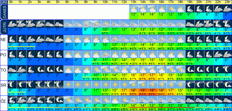 | Ura | 00h | 01h | 02h | 03h | 04h | 05h | 06h | 07h | 08h | 09h | 10h | 11h | 12h | 13h | 14h | 15h | 16h | 17h | 18h | 19h | 20h | 21h | 22h | 23h | |  |  |  |  |  |  |  |  |  |  |  |  |  |  |  |  |  |  |  |  |  |  |  |  | | Temperatura [C°] | 6°C | 5°C | 5°C | 5°C | 5°C | 5°C | 5°C | 6°C | 7°C | 9°C | 11°C | 13°C | 14°C | 14°C | 13°C | 12°C | 11°C | 10°C | 9°C | 8°C | 7°C | 6°C | 5°C | 4°C | | Občutek [C°] | 2°C | 2°C | 2°C | 2°C | 2°C | 2°C | 2°C | 3°C | 4°C | 6°C | 8°C | 9°C | 11°C | 10°C | 9°C | 8°C | 7°C | 6°C | 5°C | 4°C | 3°C | 2°C | 1°C | -0°C | | Možnost padavin | 11 % | 12 % | 14 % | 15 % | 24 % | 44 % | 45 % | 51 % | 47 % | 52 % | 47 % | 36 % | 58 % | 62 % | 64 % | 64 % | 65 % | 77 % | 64 % | 77 % | 47 % | 59 % | 46 % | 49 % | | Količina padavin [mm] | | | | | | | | 5 mm | | 5 mm | | | 2 mm | | 1 mm | 1 mm | 2 mm | 2 mm | 2 mm | 2 mm | | | | | Sneg [cm] | | | | | | | | | | | | | | | | | | | | | | | | | | UV index | | | | | | | | | | | UV 1 | UV 1 | UV 1 | UV 1 | UV 1 | UV 1 | | | | | | | | | | Hitrost vetra | 8 km/h | 7 km/h | 7 km/h | 6 km/h | 6 km/h | 7 km/h | 8 km/h | 8 km/h | 8 km/h | 9 km/h | 9 km/h | 10 km/h | 9 km/h | 10 km/h | 10 km/h | 11 km/h | 12 km/h | 11 km/h | 9 km/h | 9 km/h | 10 km/h | 11 km/h | 11 km/h | 11 km/h | Smer vetra | S | S | S | S | S | S | V | S | S | S | Z | S | S | S | S | S | S | S | S | S | S | S | S | S | | Zračni tlak | 1009 | 1008 | 1007 | 1006 | 1005 | 1005 | 1005 | 1005 | 1005 | 1005 | 1005 | 1005 | 1005 | 1004 | 1005 | 1006 | 1006 | 1006 | 1007 | 1007 | 1006 | 1006 | 1006 | 1006 | | Vlaga | 71 % | 73 % | 73 % | 73 % | 74 % | 76 % | 77 % | 77 % | 73 % | 67 % | 61 % | 55 % | 50 % | 49 % | 49 % | 51 % | 53 % | 56 % | 60 % | 65 % | 70 % | 72 % | 78 % | 82 % |
