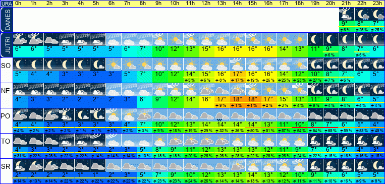 | Ura | 14h | 15h | 16h | 17h | 18h | 19h | 20h | 21h | 22h | 23h | | | | | | | | | | | | | | | |  |  |  |  |  |  |  |  |  |  | | Temperatura [C°] | 7°C | 7°C | 6°C | 6°C | 5°C | 5°C | 5°C | 4°C | 4°C | 4°C | | Občutek [C°] | 5°C | 5°C | 4°C | 4°C | 3°C | 3°C | 3°C | 3°C | 3°C | 2°C | | Možnost padavin | | | | | | | | | | 5 % | | Količina padavin [mm] | | | | | | | | | | | Sneg [cm] | | | | | | | | | | | | UV index | | | | | | | | | | | | Hitrost vetra | 3 km/h | 3 km/h | 2 km/h | 2 km/h | 2 km/h | 2 km/h | 2 km/h | 2 km/h | 2 km/h | 2 km/h | Smer vetra | V | S | J | S | S | Z | Z | V | J | V | | Zračni tlak | 1015 | 1015 | 1015 | 1015 | 1015 | 1016 | 1016 | 1016 | 1017 | 1017 | | Vlaga | 86 % | 90 % | 93 % | 95 % | 96 % | 97 % | 98 % | 98 % | 99 % | 99 % |