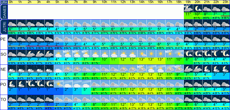 | Ura | 00h | 01h | 02h | 03h | 04h | 05h | 06h | 07h | 08h | 09h | 10h | 11h | 12h | 13h | 14h | 15h | 16h | 17h | 18h | 19h | 20h | 21h | 22h | 23h | |  |  |  |  |  |  |  |  |  |  |  |  |  |  |  |  |  |  |  |  |  |  |  |  | | Temperatura [C°] | 2°C | 2°C | 1°C | 1°C | 1°C | 1°C | 2°C | 4°C | 6°C | 8°C | 10°C | 11°C | 12°C | 12°C | 13°C | 13°C | 12°C | 11°C | 9°C | 8°C | 6°C | 5°C | 4°C | 4°C | | Občutek [C°] | -0°C | -1°C | -1°C | -2°C | -2°C | -2°C | -1°C | 1°C | 3°C | 5°C | 6°C | 7°C | 8°C | 8°C | 9°C | 9°C | 8°C | 7°C | 6°C | 4°C | 3°C | 2°C | 1°C | 0°C | | Možnost padavin | 9 % | 8 % | 7 % | 8 % | 9 % | 10 % | 11 % | 12 % | 13 % | 14 % | 14 % | 16 % | 17 % | 17 % | 18 % | 17 % | 17 % | 17 % | 17 % | 16 % | 15 % | 14 % | 12 % | 12 % | | Količina padavin [mm] | | | | | | | | | | | | | | | | | | | | | | | | | Sneg [cm] | | | | | | | | | | | | | | | | | | | | | | | | | | UV index | | | | | | | | | | UV 1 | UV 2 | UV 2 | UV 3 | UV 4 | UV 3 | UV 3 | UV 2 | UV 1 | | | | | | | | Hitrost vetra | 3 km/h | 3 km/h | 3 km/h | 3 km/h | 3 km/h | 3 km/h | 3 km/h | 3 km/h | 4 km/h | 6 km/h | 8 km/h | 9 km/h | 10 km/h | 11 km/h | 11 km/h | 10 km/h | 10 km/h | 9 km/h | 8 km/h | 7 km/h | 7 km/h | 7 km/h | 7 km/h | 6 km/h | Smer vetra | V | V | S | V | S | S | S | S | S | V | V | V | V | V | V | V | V | V | V | S | S | S | S | S | | Zračni tlak | 1011 | 1010 | 1010 | 1010 | 1010 | 1010 | 1010 | 1010 | 1010 | 1010 | 1010 | 1009 | 1009 | 1008 | 1008 | 1008 | 1007 | 1008 | 1008 | 1008 | 1009 | 1009 | 1009 | 1009 | | Vlaga | 90 % | 89 % | 93 % | 96 % | 96 % | 95 % | 87 % | 80 % | 69 % | 60 % | 54 % | 49 % | 45 % | 43 % | 42 % | 42 % | 44 % | 50 % | 57 % | 65 % | 70 % | 73 % | 74 % | 76 % |