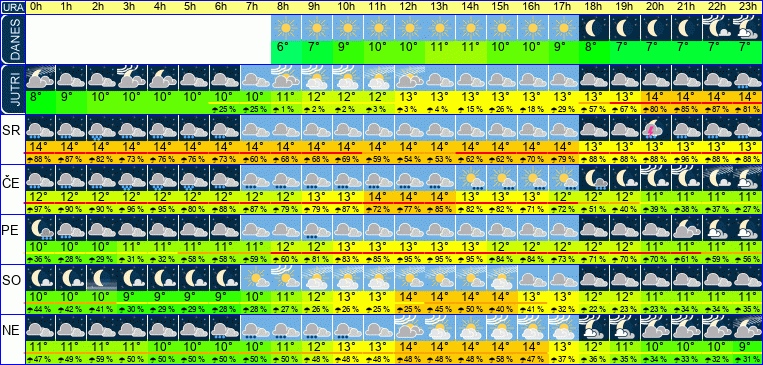 | Ura | 07h | 08h | 09h | 10h | 11h | 12h | 13h | 14h | 15h | 16h | 17h | 18h | 19h | 20h | 21h | 22h | 23h | | | | | | | | |  |  |  |  |  |  |  |  |  |  |  |  |  |  |  |  |  | | Temperatura [C°] | 5°C | 6°C | 8°C | 9°C | 10°C | 10°C | 11°C | 11°C | 10°C | 10°C | 9°C | 8°C | 7°C | 7°C | 7°C | 7°C | 7°C | | Občutek [C°] | 1°C | 2°C | 4°C | 6°C | 7°C | 7°C | 8°C | 8°C | 7°C | 7°C | 6°C | 5°C | 4°C | 4°C | 3°C | 3°C | 3°C | | Možnost padavin | | | | | | | | | | | | | | | | | | | Količina padavin [mm] | | | | | | | | | | | | | | | | | | Sneg [cm] | | | | | | | | | | | | | | | | | | | UV index | | | | | UV 1 | UV 1 | UV 2 | UV 1 | UV 1 | | | | | | | | | | Hitrost vetra | 8 km/h | 7 km/h | 6 km/h | 5 km/h | 4 km/h | 4 km/h | 5 km/h | 5 km/h | 6 km/h | 6 km/h | 5 km/h | 5 km/h | 5 km/h | 6 km/h | 8 km/h | 9 km/h | 11 km/h | Smer vetra | S | S | V | V | V | J | J | J | J | J | Z | J | V | V | V | V | V | | Zračni tlak | 1007 | 1007 | 1008 | 1008 | 1009 | 1009 | 1009 | 1009 | 1009 | 1010 | 1010 | 1011 | 1011 | 1011 | 1012 | 1012 | 1012 | | Vlaga | 65 % | 61 % | 57 % | 53 % | 50 % | 48 % | 47 % | 49 % | 52 % | 55 % | 59 % | 63 % | 67 % | 68 % | 69 % | 70 % | 70 % |