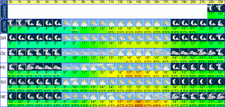 | Ura | 00h | 01h | 02h | 03h | 04h | 05h | 06h | 07h | 08h | 09h | 10h | 11h | 12h | 13h | 14h | 15h | 16h | 17h | 18h | 19h | 20h | 21h | 22h | 23h | |  |  |  |  |  |  |  |  |  |  |  |  |  |  |  |  |  |  |  |  |  |  |  |  | | Temperatura [C°] | 10°C | 9°C | 8°C | 8°C | 8°C | 8°C | 9°C | 10°C | 12°C | 14°C | 15°C | 16°C | 17°C | 17°C | 17°C | 17°C | 17°C | 16°C | 14°C | 13°C | 12°C | 11°C | 11°C | 10°C | | Občutek [C°] | 6°C | 6°C | 5°C | 5°C | 5°C | 5°C | 5°C | 6°C | 8°C | 11°C | 12°C | 13°C | 14°C | 14°C | 14°C | 14°C | 13°C | 13°C | 12°C | 10°C | 9°C | 9°C | 8°C | 7°C | | Možnost padavin | 24 % | 25 % | 19 % | 19 % | 19 % | 18 % | 18 % | 18 % | 17 % | 16 % | 15 % | 14 % | 14 % | 14 % | 24 % | 14 % | 23 % | 13 % | 12 % | 11 % | 10 % | 19 % | 19 % | 19 % | | Količina padavin [mm] | | | | | | | | | | | | | | | | | | | | | | | | | Sneg [cm] | | | | | | | | | | | | | | | | | | | | | | | | | | UV index | | | | | | | | | | | UV 1 | UV 2 | UV 3 | UV 3 | UV 3 | UV 2 | UV 1 | | | | | | | | | Hitrost vetra | 12 km/h | 12 km/h | 11 km/h | 11 km/h | 11 km/h | 12 km/h | 12 km/h | 12 km/h | 10 km/h | 9 km/h | 9 km/h | 10 km/h | 11 km/h | 11 km/h | 11 km/h | 11 km/h | 11 km/h | 10 km/h | 9 km/h | 8 km/h | 8 km/h | 8 km/h | 8 km/h | 8 km/h | Smer vetra | V | S | S | S | S | S | S | S | S | S | V | Z | Z | Z | Z | Z | Z | Z | Z | S | S | S | S | S | | Zračni tlak | 1012 | 1012 | 1012 | 1012 | 1012 | 1012 | 1012 | 1013 | 1013 | 1013 | 1013 | 1013 | 1013 | 1013 | 1013 | 1013 | 1013 | 1013 | 1013 | 1014 | 1014 | 1014 | 1014 | 1014 | | Vlaga | 81 % | 82 % | 77 % | 77 % | 75 % | 74 % | 71 % | 67 % | 62 % | 56 % | 51 % | 48 % | 45 % | 44 % | 44 % | 46 % | 48 % | 52 % | 57 % | 62 % | 65 % | 69 % | 70 % | 71 % |