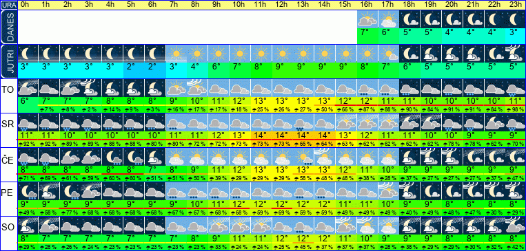 | Ura | 00h | 01h | 02h | 03h | 04h | 05h | 06h | 07h | 08h | 09h | 10h | 11h | 12h | 13h | 14h | 15h | 16h | 17h | 18h | 19h | 20h | 21h | 22h | 23h | |  |  |  |  |  |  |  |  |  |  |  |  |  |  |  |  |  |  |  |  |  |  |  |  | | Temperatura [C°] | 6°C | 7°C | 7°C | 7°C | 8°C | 8°C | 8°C | 9°C | 10°C | 11°C | 12°C | 13°C | 13°C | 13°C | 13°C | 12°C | 12°C | 11°C | 11°C | 10°C | 10°C | 10°C | 10°C | 11°C | | Občutek [C°] | 3°C | 3°C | 3°C | 3°C | 3°C | 3°C | 3°C | 3°C | 4°C | 6°C | 6°C | 7°C | 7°C | 7°C | 7°C | 7°C | 6°C | 6°C | 5°C | 5°C | 5°C | 6°C | 6°C | 7°C | | Možnost padavin | | 7 % | 8 % | 2 % | 14 % | 9 % | 3 % | 16 % | 17 % | 17 % | 18 % | 25 % | 26 % | 27 % | 50 % | 66 % | 87 % | 88 % | 90 % | 84 % | 91 % | 91 % | 84 % | 98 % | | Količina padavin [mm] | | | | | | | | | | | | | | | | | 1 mm | 1 mm | 2 mm | | 2 mm | 2 mm | | 3 mm | Sneg [cm] | | | | | | | | | | | | | | | | | | | | | | | | | | UV index | | | | | | | | | | | | | | UV 1 | | | | | | | | | | | | Hitrost vetra | 9 km/h | 11 km/h | 13 km/h | 15 km/h | 17 km/h | 20 km/h | 22 km/h | 23 km/h | 25 km/h | 27 km/h | 29 km/h | 30 km/h | 30 km/h | 30 km/h | 30 km/h | 30 km/h | 29 km/h | 28 km/h | 27 km/h | 26 km/h | 26 km/h | 24 km/h | 23 km/h | 19 km/h | Smer vetra | V | J | V | V | J | J | J | J | J | J | J | J | J | J | J | J | J | J | J | J | J | J | J | J | | Zračni tlak | 1012 | 1012 | 1012 | 1012 | 1011 | 1011 | 1011 | 1011 | 1011 | 1010 | 1010 | 1010 | 1010 | 1009 | 1009 | 1009 | 1009 | 1008 | 1008 | 1008 | 1008 | 1008 | 1007 | 1007 | | Vlaga | 83 % | 83 % | 82 % | 83 % | 84 % | 85 % | 86 % | 86 % | 85 % | 80 % | 78 % | 76 % | 77 % | 79 % | 82 % | 84 % | 90 % | 94 % | 95 % | 97 % | 98 % | 99 % | 99 % | 100 % |