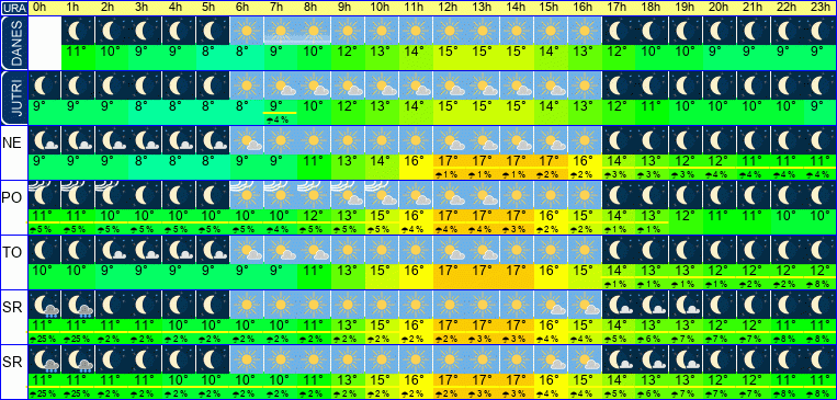 | Ura | 00h | 01h | 02h | 03h | 04h | 05h | 06h | 07h | 08h | 09h | 10h | 11h | 12h | 13h | 14h | 15h | 16h | 17h | 18h | 19h | 20h | 21h | 22h | 23h | |  |  |  |  |  |  |  |  |  |  |  |  |  |  |  |  |  |  |  |  |  |  |  |  | | Temperatura [C°] | 11°C | 11°C | 11°C | 11°C | 10°C | 10°C | 10°C | 10°C | 11°C | 13°C | 15°C | 16°C | 17°C | 17°C | 17°C | 16°C | 15°C | 14°C | 13°C | 13°C | 12°C | 12°C | 11°C | 11°C | | Občutek [C°] | 9°C | 9°C | 9°C | 8°C | 8°C | 8°C | 8°C | 8°C | 9°C | 11°C | 13°C | 14°C | 14°C | 15°C | 15°C | 14°C | 13°C | 12°C | 11°C | 11°C | 10°C | 10°C | 9°C | 9°C | | Možnost padavin | 25 % | 25 % | 2 % | 2 % | 2 % | 2 % | 2 % | 2 % | 2 % | 2 % | 2 % | 2 % | 2 % | 3 % | 3 % | 4 % | 4 % | 5 % | 6 % | 7 % | 7 % | 7 % | 8 % | 8 % | | Količina padavin [mm] | | | | | | | | | | | | | | | | | | | | | | | | | Sneg [cm] | | | | | | | | | | | | | | | | | | | | | | | | | | UV index | | | | | | | | | | | UV 1 | UV 1 | UV 2 | UV 2 | UV 2 | UV 1 | | | | | | | | | | Hitrost vetra | 7 km/h | 7 km/h | 7 km/h | 7 km/h | 8 km/h | 8 km/h | 8 km/h | 8 km/h | 8 km/h | 6 km/h | 5 km/h | 5 km/h | 6 km/h | 7 km/h | 7 km/h | 6 km/h | 6 km/h | 6 km/h | 6 km/h | 7 km/h | 7 km/h | 7 km/h | 7 km/h | 7 km/h | Smer vetra | V | S | S | S | S | V | V | V | V | V | Z | Z | Z | Z | Z | Z | Z | S | S | S | S | S | V | V | | Zračni tlak | 1021 | 1021 | 1021 | 1021 | 1021 | 1021 | 1021 | 1022 | 1022 | 1022 | 1022 | 1022 | 1022 | 1021 | 1022 | 1022 | 1022 | 1022 | 1023 | 1024 | 1024 | 1024 | 1024 | 1024 | | Vlaga | 73 % | 73 % | 74 % | 76 % | 77 % | 77 % | 76 % | 74 % | 69 % | 62 % | 55 % | 50 % | 47 % | 46 % | 47 % | 50 % | 56 % | 61 % | 66 % | 69 % | 71 % | 72 % | 73 % | 73 % |