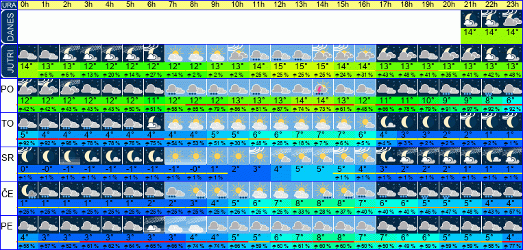 | Ura | 00h | 01h | 02h | 03h | 04h | 05h | 06h | 07h | 08h | 09h | 10h | 11h | 12h | 13h | 14h | 15h | 16h | 17h | 18h | 19h | 20h | 21h | 22h | 23h | |  |  |  |  |  |  |  |  |  |  |  |  |  |  |  |  |  |  |  |  |  |  |  |  | | Temperatura [C°] | 12°C | 11°C | 11°C | 11°C | 11°C | 11°C | 11°C | 11°C | 11°C | 12°C | 12°C | 13°C | 13°C | 14°C | 14°C | 13°C | 12°C | 11°C | 11°C | 9°C | 9°C | 8°C | 7°C | 6°C | | Občutek [C°] | 10°C | 10°C | 10°C | 10°C | 10°C | 10°C | 10°C | 10°C | 10°C | 11°C | 11°C | 11°C | 11°C | 11°C | 11°C | 11°C | 10°C | 10°C | 9°C | 8°C | 6°C | 5°C | 4°C | 3°C | | Možnost padavin | 43 % | 43 % | 50 % | 44 % | 44 % | 39 % | 40 % | 53 % | 54 % | 80 % | 93 % | 81 % | 87 % | 81 % | 77 % | 69 % | 68 % | 76 % | 69 % | 84 % | 98 % | 98 % | 91 % | 91 % | | Količina padavin [mm] | | | | | | | | | | 1 mm | | | 3 mm | 4 mm | | | 2 mm | 2 mm | 1 mm | | 3 mm | 2 mm | 2 mm | 2 mm | Sneg [cm] | | | | | | | | | | | | | | | | | | | | | | | | | | UV index | | | | | | | | | | | | | | | | | | | | | | | | | | Hitrost vetra | 8 km/h | 7 km/h | 7 km/h | 5 km/h | 6 km/h | 6 km/h | 6 km/h | 7 km/h | 7 km/h | 8 km/h | 10 km/h | 12 km/h | 14 km/h | 14 km/h | 15 km/h | 13 km/h | 11 km/h | 8 km/h | 6 km/h | 7 km/h | 6 km/h | 6 km/h | 7 km/h | 8 km/h | Smer vetra | Z | Z | Z | V | S | S | V | V | V | S | S | Z | Z | Z | Z | Z | Z | Z | S | S | S | S | S | V | | Zračni tlak | 1008 | 1007 | 1007 | 1006 | 1005 | 1005 | 1004 | 1003 | 1003 | 1003 | 1003 | 1002 | 1002 | 1002 | 1002 | 1002 | 1003 | 1004 | 1005 | 1006 | 1007 | 1008 | 1009 | 1011 | | Vlaga | 90 % | 87 % | 88 % | 90 % | 90 % | 90 % | 90 % | 90 % | 91 % | 91 % | 92 % | 87 % | 85 % | 82 % | 80 % | 79 % | 80 % | 83 % | 86 % | 88 % | 84 % | 88 % | 87 % | 87 % |