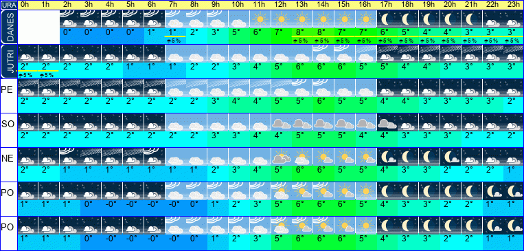 | Ura | 01h | 02h | 03h | 04h | 05h | 06h | 07h | 08h | 09h | 10h | 11h | 12h | 13h | 14h | 15h | 16h | 17h | 18h | 19h | 20h | 21h | 22h | 23h | | |  |  |  |  |  |  |  |  |  |  |  |  |  |  |  |  |  |  |  |  |  |  |  | | Temperatura [C°] | 0°C | 0°C | 0°C | 0°C | 0°C | 1°C | 1°C | 2°C | 3°C | 5°C | 6°C | 7°C | 8°C | 8°C | 7°C | 7°C | 6°C | 5°C | 4°C | 4°C | 3°C | 3°C | 3°C | | Občutek [C°] | -3°C | -3°C | -3°C | -3°C | -3°C | -3°C | -2°C | -1°C | 0°C | 2°C | 4°C | 5°C | 6°C | 6°C | 5°C | 5°C | 4°C | 3°C | 2°C | 1°C | 1°C | 0°C | 0°C | | Možnost padavin | | | | | | | 5 % | | | | | | 5 % | 5 % | 5 % | 5 % | 5 % | 5 % | 5 % | 5 % | 5 % | 5 % | 5 % | | Količina padavin [mm] | | | | | | | | | | | | | | | | | | | | | | | | Sneg [cm] | | | | | | | | | | | | | | | | | | | | | | | | | UV index | | | | | | | | | | | UV 1 | UV 1 | UV 1 | UV 1 | | | | | | | | | | | Hitrost vetra | 6 km/h | 7 km/h | 6 km/h | 6 km/h | 6 km/h | 6 km/h | 6 km/h | 5 km/h | 5 km/h | 5 km/h | 5 km/h | 5 km/h | 5 km/h | 6 km/h | 5 km/h | 5 km/h | 5 km/h | 5 km/h | 5 km/h | 4 km/h | 4 km/h | 4 km/h | 3 km/h | Smer vetra | S | S | S | S | S | S | S | S | S | S | S | S | S | Z | Z | S | S | S | S | S | S | S | S | | Zračni tlak | 1023 | 1023 | 1023 | 1023 | 1023 | 1023 | 1023 | 1024 | 1024 | 1024 | 1023 | 1023 | 1022 | 1022 | 1023 | 1023 | 1023 | 1024 | 1024 | 1025 | 1025 | 1025 | 1025 | | Vlaga | 97 % | 97 % | 97 % | 96 % | 96 % | 96 % | 95 % | 94 % | 93 % | 90 % | 85 % | 83 % | 83 % | 84 % | 86 % | 87 % | 89 % | 91 % | 93 % | 95 % | 95 % | 96 % | 97 % |