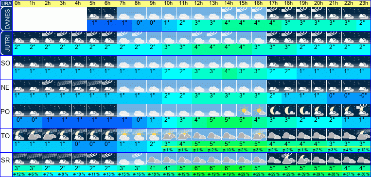 | Ura | 00h | 01h | 02h | 03h | 04h | 05h | 06h | 07h | 08h | 09h | 10h | 11h | 12h | 13h | 14h | 15h | 16h | 17h | 18h | 19h | 20h | 21h | 22h | 23h | |  |  |  |  |  |  |  |  |  |  |  |  |  |  |  |  |  |  |  |  |  |  |  |  | | Temperatura [C°] | -0°C | -0°C | -0°C | -1°C | -1°C | -1°C | -1°C | -1°C | -0°C | 1°C | 2°C | 3°C | 5°C | 6°C | 6°C | 6°C | 5°C | 4°C | 3°C | 2°C | 2°C | 1°C | 1°C | 1°C | | Občutek [C°] | -3°C | -3°C | -3°C | -4°C | -4°C | -4°C | -4°C | -4°C | -3°C | -2°C | -1°C | 1°C | 2°C | 3°C | 3°C | 3°C | 2°C | 1°C | -0°C | -1°C | -2°C | -2°C | -2°C | -2°C | | Možnost padavin | | | | | | | | | | | | | | | | | | | | | | | | | | Količina padavin [mm] | | | | | | | | | | | | | | | | | | | | | | | | | Sneg [cm] | | | | | | | | | | | | | | | | | | | | | | | | | | UV index | | | | | | | | | | | | UV 1 | UV 1 | UV 1 | UV 1 | | | | | | | | | | | Hitrost vetra | 3 km/h | 3 km/h | 3 km/h | 3 km/h | 4 km/h | 3 km/h | 3 km/h | 3 km/h | 3 km/h | 4 km/h | 4 km/h | 4 km/h | 4 km/h | 5 km/h | 5 km/h | 4 km/h | 4 km/h | 4 km/h | 5 km/h | 5 km/h | 4 km/h | 4 km/h | 4 km/h | 4 km/h | Smer vetra | Z | Z | Z | Z | Z | Z | Z | Z | Z | Z | Z | S | S | S | S | Z | Z | Z | Z | Z | Z | Z | Z | Z | | Zračni tlak | 1028 | 1028 | 1028 | 1027 | 1027 | 1027 | 1027 | 1027 | 1027 | 1027 | 1026 | 1026 | 1025 | 1024 | 1024 | 1024 | 1024 | 1024 | 1024 | 1025 | 1025 | 1025 | 1025 | 1024 | | Vlaga | 94 % | 95 % | 95 % | 96 % | 96 % | 97 % | 97 % | 96 % | 93 % | 91 % | 87 % | 82 % | 77 % | 74 % | 73 % | 74 % | 77 % | 81 % | 83 % | 86 % | 87 % | 88 % | 89 % | 90 % |