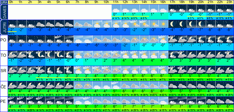 | Ura | 00h | 01h | 02h | 03h | 04h | 05h | 06h | 07h | 08h | 09h | 10h | 11h | 12h | 13h | 14h | 15h | 16h | 17h | 18h | 19h | 20h | 21h | 22h | 23h | |  |  |  |  |  |  |  |  |  |  |  |  |  |  |  |  |  |  |  |  |  |  |  |  | | Temperatura [C°] | -3°C | -3°C | -3°C | -3°C | -3°C | -2°C | -2°C | -2°C | -1°C | -0°C | 1°C | 2°C | 3°C | 4°C | 4°C | 3°C | 3°C | 2°C | 2°C | 1°C | 1°C | 1°C | 0°C | 0°C | | Občutek [C°] | -7°C | -7°C | -7°C | -7°C | -6°C | -6°C | -6°C | -6°C | -5°C | -4°C | -3°C | -2°C | -0°C | 0°C | 1°C | 0°C | -0°C | -1°C | -2°C | -2°C | -2°C | -2°C | -3°C | -3°C | | Možnost padavin | | | | | | | | | | | | | | | | | | | | | | | | | | Količina padavin [mm] | | | | | | | | | | | | | | | | | | | | | | | | | Sneg [cm] | | | | | | | | | | | | | | | | | | | | | | | | | | UV index | | | | | | | | | | | | | | | | | | | | | | | | | | Hitrost vetra | 7 km/h | 7 km/h | 7 km/h | 7 km/h | 7 km/h | 7 km/h | 7 km/h | 7 km/h | 7 km/h | 7 km/h | 7 km/h | 7 km/h | 7 km/h | 7 km/h | 7 km/h | 7 km/h | 7 km/h | 7 km/h | 7 km/h | 7 km/h | 7 km/h | 7 km/h | 6 km/h | 6 km/h | Smer vetra | S | S | S | S | S | S | S | S | S | S | S | S | Z | Z | Z | Z | Z | Z | Z | Z | S | S | S | S | | Zračni tlak | 1023 | 1023 | 1023 | 1023 | 1023 | 1023 | 1022 | 1022 | 1023 | 1023 | 1023 | 1022 | 1022 | 1021 | 1022 | 1022 | 1022 | 1022 | 1023 | 1023 | 1023 | 1024 | 1024 | 1024 | | Vlaga | 98 % | 100 % | 100 % | 99 % | 98 % | 97 % | 97 % | 95 % | 96 % | 98 % | 97 % | 97 % | 93 % | 90 % | 89 % | 91 % | 92 % | 93 % | 95 % | 97 % | 97 % | 99 % | 100 % | 100 % |