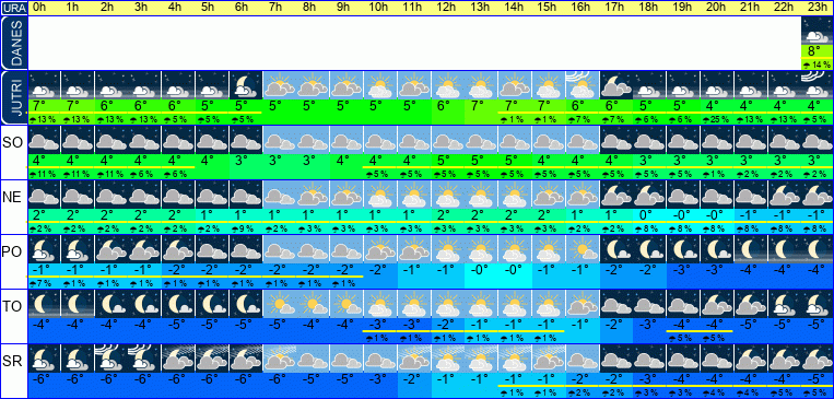 | Ura | 00h | 01h | 02h | 03h | 04h | 05h | 06h | 07h | 08h | 09h | 10h | 11h | 12h | 13h | 14h | 15h | 16h | 17h | 18h | 19h | 20h | 21h | 22h | 23h | |  |  |  |  |  |  |  |  |  |  |  |  |  |  |  |  |  |  |  |  |  |  |  |  | | Temperatura [C°] | 7°C | 7°C | 6°C | 6°C | 6°C | 5°C | 5°C | 5°C | 5°C | 5°C | 5°C | 5°C | 6°C | 7°C | 7°C | 7°C | 6°C | 6°C | 5°C | 5°C | 4°C | 4°C | 4°C | 4°C | | Občutek [C°] | 5°C | 5°C | 4°C | 4°C | 4°C | 3°C | 3°C | 3°C | 3°C | 3°C | 3°C | 3°C | 4°C | 5°C | 5°C | 4°C | 4°C | 3°C | 3°C | 3°C | 2°C | 2°C | 2°C | 2°C | | Možnost padavin | 13 % | 13 % | 13 % | 13 % | 5 % | 5 % | 5 % | | | | | | | | 1 % | 1 % | 7 % | 7 % | 6 % | 6 % | 25 % | 13 % | 13 % | 5 % | | Količina padavin [mm] | | | | | | | | | | | | | | | | | | | | | | | | | Sneg [cm] | | | | | | | | | | | | | | | | | | | | | | | | | | UV index | | | | | | | | | | | | | | | | | | | | | | | | | | Hitrost vetra | 4 km/h | 4 km/h | 3 km/h | 4 km/h | 3 km/h | 3 km/h | 3 km/h | 3 km/h | 3 km/h | 3 km/h | 3 km/h | 3 km/h | 3 km/h | 4 km/h | 4 km/h | 4 km/h | 4 km/h | 4 km/h | 3 km/h | 3 km/h | 3 km/h | 3 km/h | 3 km/h | 3 km/h | Smer vetra | S | S | S | S | S | S | S | S | S | S | S | S | S | S | Z | S | S | S | S | S | S | S | S | S | | Zračni tlak | 1022 | 1022 | 1022 | 1022 | 1021 | 1021 | 1021 | 1021 | 1022 | 1022 | 1022 | 1022 | 1022 | 1022 | 1022 | 1022 | 1022 | 1022 | 1022 | 1023 | 1023 | 1023 | 1023 | 1024 | | Vlaga | 89 % | 90 % | 91 % | 91 % | 92 % | 92 % | 92 % | 92 % | 92 % | 92 % | 91 % | 90 % | 88 % | 87 % | 88 % | 88 % | 90 % | 91 % | 93 % | 95 % | 95 % | 96 % | 96 % | 95 % |