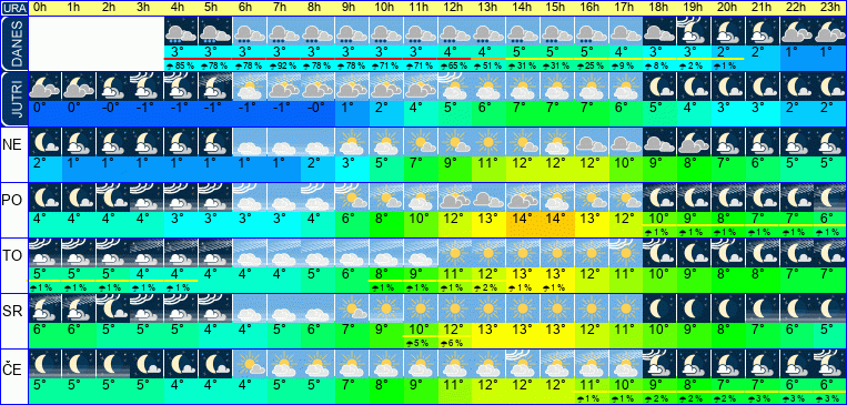 | Temperatura: | 0°C / 3°C / 5°C (+-1°C) | Možnost padavin: | 68 % | Hitrost vetra: | 5 / 7 / 10 km/h (+-5) | Skupna oblačnost: | 54 / 91 / 100 % (+-15) |