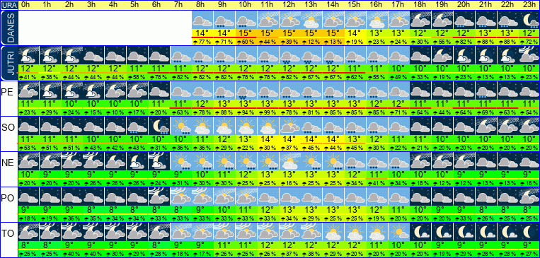 | Ura | 06h | 07h | 08h | 09h | 10h | 11h | 12h | 13h | 14h | 15h | 16h | 17h | 18h | 19h | 20h | 21h | 22h | 23h | | | | | | | |  |  |  |  |  |  |  |  |  |  |  |  |  |  |  |  |  |  | | Temperatura [C°] | 13°C | 14°C | 14°C | 14°C | 15°C | 15°C | 15°C | 15°C | 15°C | 14°C | 13°C | 13°C | 12°C | 12°C | 12°C | 13°C | 13°C | 12°C | | Občutek [C°] | 8°C | 9°C | 8°C | 9°C | 8°C | 7°C | 7°C | 6°C | 6°C | 6°C | 5°C | 5°C | 5°C | 6°C | 5°C | 5°C | 5°C | 5°C | | Možnost padavin | 85 % | 85 % | 56 % | 56 % | 51 % | 36 % | 30 % | 16 % | 17 % | 10 % | 10 % | 37 % | 38 % | 44 % | 72 % | 85 % | 79 % | 66 % | | Količina padavin [mm] | 1 mm | 1 mm | | | | | | | | | | | | | | 1 mm | | | Sneg [cm] | | | | | | | | | | | | | | | | | | | | UV index | | | | | | | | | | | | | | | | | | | | Hitrost vetra | 29 km/h | 28 km/h | 35 km/h | 33 km/h | 35 km/h | 39 km/h | 43 km/h | 45 km/h | 44 km/h | 42 km/h | 40 km/h | 37 km/h | 33 km/h | 32 km/h | 35 km/h | 38 km/h | 37 km/h | 37 km/h | Smer vetra | J | J | V | V | V | V | V | V | V | V | V | V | V | V | V | V | V | V | | Zračni tlak | 1004 | 1004 | 1003 | 1003 | 1003 | 1001 | 1000 | 999 | 998 | 997 | 997 | 996 | 995 | 994 | 993 | 993 | 992 | 992 | | Vlaga | 91 % | 89 % | 86 % | 84 % | 80 % | 78 % | 76 % | 76 % | 76 % | 75 % | 74 % | 73 % | 71 % | 71 % | 76 % | 82 % | 82 % | 81 % |