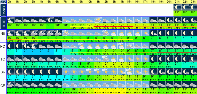 | Ura | 20h | 21h | 22h | 23h | | | | | | | | | | | | | | | | | | | | | |  |  |  |  | | Temperatura [C°] | 11°C | 11°C | 10°C | 10°C | | Občutek [C°] | 10°C | 9°C | 7°C | 7°C | | Možnost padavin | | | | | | Količina padavin [mm] | | | | | Sneg [cm] | | | | | | UV index | | | | | | Hitrost vetra | 4 km/h | 6 km/h | 11 km/h | 12 km/h | Smer vetra | S | V | V | V | | Zračni tlak | 997 | 997 | 997 | 997 | | Vlaga | 91 % | 89 % | 86 % | 89 % |