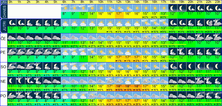 | Ura | 00h | 01h | 02h | 03h | 04h | 05h | 06h | 07h | 08h | 09h | 10h | 11h | 12h | 13h | 14h | 15h | 16h | 17h | 18h | 19h | 20h | 21h | 22h | 23h | |  |  |  |  |  |  |  |  |  |  |  |  |  |  |  |  |  |  |  |  |  |  |  |  | | Temperatura [C°] | 9°C | 9°C | 8°C | 8°C | 8°C | 8°C | 8°C | 10°C | 12°C | 13°C | 15°C | 16°C | 17°C | 17°C | 16°C | 16°C | 15°C | 14°C | 12°C | 11°C | 11°C | 10°C | 10°C | 10°C | | Občutek [C°] | 8°C | 7°C | 6°C | 6°C | 6°C | 5°C | 6°C | 8°C | 10°C | 12°C | 13°C | 14°C | 15°C | 15°C | 14°C | 13°C | 13°C | 11°C | 11°C | 11°C | 10°C | 10°C | 9°C | 8°C | | Možnost padavin | | | | | | | | | | | | 1 % | 1 % | 2 % | 2 % | 2 % | 2 % | 2 % | | | | | | | | Količina padavin [mm] | | | | | | | | | | | | | | | | | | | | | | | | | Sneg [cm] | | | | | | | | | | | | | | | | | | | | | | | | | | UV index | | | | | | | | | | UV 1 | UV 1 | UV 2 | UV 3 | UV 3 | UV 3 | UV 2 | UV 1 | UV 1 | | | | | | | | Hitrost vetra | 5 km/h | 5 km/h | 5 km/h | 5 km/h | 5 km/h | 10 km/h | 6 km/h | 5 km/h | 4 km/h | 5 km/h | 6 km/h | 7 km/h | 5 km/h | 7 km/h | 9 km/h | 11 km/h | 11 km/h | 13 km/h | 6 km/h | 3 km/h | 2 km/h | 2 km/h | 5 km/h | 4 km/h | Smer vetra | S | S | S | S | S | V | V | S | V | V | V | J | J | Z | Z | Z | Z | Z | Z | S | S | V | V | V | | Zračni tlak | 1021 | 1020 | 1020 | 1020 | 1019 | 1019 | 1019 | 1019 | 1019 | 1019 | 1019 | 1018 | 1018 | 1017 | 1017 | 1016 | 1016 | 1015 | 1015 | 1015 | 1015 | 1015 | 1015 | 1014 | | Vlaga | 87 % | 87 % | 85 % | 85 % | 85 % | 83 % | 80 % | 76 % | 69 % | 62 % | 57 % | 55 % | 55 % | 55 % | 59 % | 64 % | 71 % | 77 % | 83 % | 86 % | 89 % | 92 % | 93 % | 95 % |