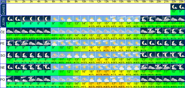 | Ura | 00h | 01h | 02h | 03h | 04h | 05h | 06h | 07h | 08h | 09h | 10h | 11h | 12h | 13h | 14h | 15h | 16h | 17h | 18h | 19h | 20h | 21h | 22h | 23h | |  |  |  |  |  |  |  |  |  |  |  |  |  |  |  |  |  |  |  |  |  |  |  |  | | Temperatura [C°] | 10°C | 10°C | 9°C | 9°C | 9°C | 9°C | 9°C | 10°C | 12°C | 14°C | 16°C | 17°C | 17°C | 17°C | 17°C | 16°C | 15°C | 14°C | 13°C | 12°C | 11°C | 11°C | 10°C | 10°C | | Občutek [C°] | 7°C | 6°C | 6°C | 6°C | 6°C | 6°C | 6°C | 8°C | 9°C | 12°C | 13°C | 14°C | 15°C | 14°C | 14°C | 13°C | 13°C | 12°C | 12°C | 11°C | 10°C | 10°C | 10°C | 9°C | | Možnost padavin | 1 % | 1 % | 7 % | 7 % | 7 % | 7 % | 7 % | 1 % | 1 % | 1 % | 1 % | 3 % | 5 % | 7 % | 7 % | 7 % | 6 % | 5 % | 4 % | 2 % | 2 % | 1 % | 1 % | 1 % | | Količina padavin [mm] | | | | | | | | | | | | | | | | | | | | | | | | | Sneg [cm] | | | | | | | | | | | | | | | | | | | | | | | | | | UV index | | | | | | | | | | | UV 1 | UV 2 | UV 2 | UV 3 | UV 2 | UV 2 | UV 1 | | | | | | | | | Hitrost vetra | 10 km/h | 10 km/h | 10 km/h | 9 km/h | 8 km/h | 8 km/h | 7 km/h | 6 km/h | 7 km/h | 7 km/h | 7 km/h | 8 km/h | 10 km/h | 13 km/h | 12 km/h | 11 km/h | 8 km/h | 7 km/h | 4 km/h | 3 km/h | 4 km/h | 4 km/h | 2 km/h | 2 km/h | Smer vetra | V | V | V | V | V | V | V | V | V | V | J | J | J | J | J | J | Z | Z | Z | S | S | S | S | S | | Zračni tlak | 1011 | 1011 | 1011 | 1011 | 1012 | 1012 | 1012 | 1013 | 1013 | 1014 | 1014 | 1014 | 1014 | 1014 | 1014 | 1014 | 1013 | 1014 | 1014 | 1014 | 1015 | 1015 | 1015 | 1015 | | Vlaga | 71 % | 71 % | 72 % | 71 % | 70 % | 69 % | 65 % | 61 % | 57 % | 54 % | 50 % | 49 % | 51 % | 53 % | 52 % | 56 % | 60 % | 68 % | 76 % | 82 % | 84 % | 84 % | 86 % | 88 % |