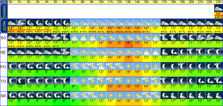 | Ura | 00h | 01h | 02h | 03h | 04h | 05h | 06h | 07h | 08h | 09h | 10h | 11h | 12h | 13h | 14h | 15h | 16h | 17h | 18h | 19h | 20h | 21h | 22h | 23h | |  |  |  |  |  |  |  |  |  |  |  |  |  |  |  |  |  |  |  |  |  |  |  |  | | Temperatura [C°] | 13°C | 13°C | 12°C | 12°C | 12°C | 11°C | 11°C | 11°C | 12°C | 13°C | 14°C | 15°C | 15°C | 16°C | 15°C | 14°C | 13°C | 12°C | 12°C | 12°C | 11°C | 11°C | 11°C | 11°C | | Občutek [C°] | 11°C | 10°C | 10°C | 10°C | 9°C | 9°C | 9°C | 10°C | 11°C | 13°C | 14°C | 15°C | 15°C | 15°C | 14°C | 13°C | 12°C | 11°C | 11°C | 11°C | 10°C | 10°C | 10°C | 10°C | | Možnost padavin | 16 % | 16 % | 16 % | 9 % | 2 % | 1 % | | | | | | | | | | | | | | | | | | | | Količina padavin [mm] | | | | | | | | | | | | | | | | | | | | | | | | | Sneg [cm] | | | | | | | | | | | | | | | | | | | | | | | | | | UV index | | | | | | | | | | | | UV 1 | UV 1 | UV 1 | UV 1 | | | | | | | | | | | Hitrost vetra | 9 km/h | 9 km/h | 10 km/h | 10 km/h | 10 km/h | 8 km/h | 6 km/h | 6 km/h | 5 km/h | 4 km/h | 3 km/h | 1 km/h | 1 km/h | 1 km/h | 2 km/h | 3 km/h | 4 km/h | 4 km/h | 3 km/h | 4 km/h | 5 km/h | 5 km/h | 5 km/h | 5 km/h | Smer vetra | S | S | S | S | S | S | S | S | S | S | S | S | S | Z | Z | Z | Z | S | S | S | S | S | S | S | | Zračni tlak | 1007 | 1008 | 1008 | 1008 | 1008 | 1009 | 1009 | 1010 | 1010 | 1010 | 1011 | 1010 | 1010 | 1010 | 1010 | 1010 | 1010 | 1011 | 1011 | 1011 | 1011 | 1012 | 1012 | 1012 | | Vlaga | 79 % | 77 % | 79 % | 78 % | 80 % | 83 % | 82 % | 83 % | 80 % | 75 % | 71 % | 68 % | 65 % | 65 % | 71 % | 77 % | 82 % | 84 % | 85 % | 84 % | 84 % | 85 % | 85 % | 83 % |