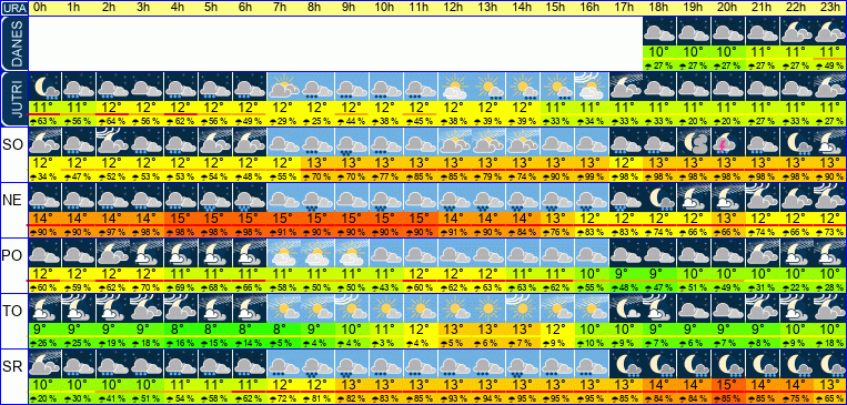 | Ura | 00h | 01h | 02h | 03h | 04h | 05h | 06h | 07h | 08h | 09h | 10h | 11h | 12h | 13h | 14h | 15h | 16h | 17h | 18h | 19h | 20h | 21h | 22h | 23h | |  |  |  |  |  |  |  |  |  |  |  |  |  |  |  |  |  |  |  |  |  |  |  |  | | Temperatura [C°] | 12°C | 12°C | 12°C | 12°C | 11°C | 11°C | 11°C | 11°C | 11°C | 11°C | 11°C | 12°C | 12°C | 12°C | 11°C | 11°C | 10°C | 9°C | 9°C | 10°C | 10°C | 10°C | 10°C | 10°C | | Občutek [C°] | 10°C | 9°C | 9°C | 9°C | 9°C | 9°C | 8°C | 8°C | 8°C | 8°C | 8°C | 8°C | 8°C | 8°C | 8°C | 7°C | 7°C | 6°C | 7°C | 7°C | 7°C | 7°C | 7°C | 7°C | | Možnost padavin | 62 % | 61 % | 65 % | 72 % | 72 % | 71 % | 69 % | 61 % | 54 % | 54 % | 48 % | 64 % | 65 % | 66 % | 66 % | 64 % | 57 % | 50 % | 49 % | 53 % | 52 % | 35 % | 27 % | 32 % | | Količina padavin [mm] | | | | | | | | | | | | | | | | | | | | | | | | | Sneg [cm] | | | | | | | | | | | | | | | | | | | | | | | | | | UV index | | | | | | | | | | | | UV 1 | UV 1 | UV 1 | UV 1 | UV 1 | | | | | | | | | | Hitrost vetra | 13 km/h | 13 km/h | 13 km/h | 13 km/h | 13 km/h | 13 km/h | 13 km/h | 13 km/h | 14 km/h | 14 km/h | 15 km/h | 15 km/h | 15 km/h | 15 km/h | 15 km/h | 15 km/h | 14 km/h | 14 km/h | 13 km/h | 13 km/h | 13 km/h | 12 km/h | 12 km/h | 12 km/h | Smer vetra | Z | J | J | V | V | V | V | V | V | V | V | J | J | J | J | J | V | V | V | V | V | V | V | S | | Zračni tlak | 998 | 999 | 999 | 999 | 999 | 999 | 998 | 998 | 998 | 998 | 997 | 997 | 997 | 996 | 996 | 996 | 996 | 996 | 996 | 997 | 997 | 998 | 998 | 998 | | Vlaga | 87 % | 86 % | 85 % | 86 % | 88 % | 89 % | 90 % | 89 % | 88 % | 86 % | 85 % | 84 % | 83 % | 83 % | 84 % | 88 % | 93 % | 95 % | 93 % | 92 % | 89 % | 88 % | 86 % | 85 % |