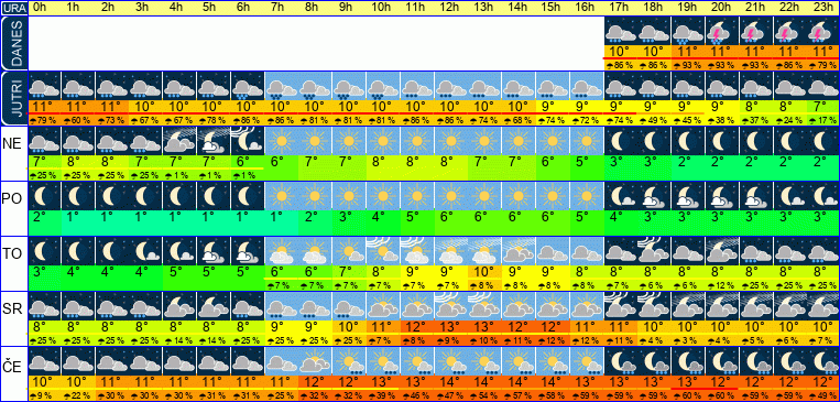 | Ura | 00h | 01h | 02h | 03h | 04h | 05h | 06h | 07h | 08h | 09h | 10h | 11h | 12h | 13h | 14h | 15h | 16h | 17h | 18h | 19h | 20h | 21h | 22h | 23h | |  |  |  |  |  |  |  |  |  |  |  |  |  |  |  |  |  |  |  |  |  |  |  |  | | Temperatura [C°] | 11°C | 10°C | 10°C | 10°C | 10°C | 10°C | 10°C | 10°C | 10°C | 10°C | 10°C | 10°C | 10°C | 10°C | 10°C | 10°C | 9°C | 9°C | 9°C | 9°C | 9°C | 8°C | 8°C | 8°C | | Občutek [C°] | 7°C | 7°C | 7°C | 7°C | 7°C | 7°C | 6°C | 6°C | 6°C | 6°C | 6°C | 7°C | 7°C | 7°C | 6°C | 6°C | 5°C | 5°C | 5°C | 5°C | 4°C | 3°C | 2°C | 2°C | | Možnost padavin | 74 % | 63 % | 74 % | 63 % | 56 % | 68 % | 69 % | 74 % | 82 % | 81 % | 93 % | 87 % | 87 % | 88 % | 97 % | 86 % | 86 % | 69 % | 58 % | 25 % | 25 % | 25 % | 25 % | 25 % | | Količina padavin [mm] | 1 mm | 1 mm | 1 mm | 1 mm | 1 mm | 1 mm | | | | 1 mm | 1 mm | 1 mm | 1 mm | 2 mm | 2 mm | 2 mm | 1 mm | 1 mm | 1 mm | 1 mm | 1 mm | 1 mm | 1 mm | | Sneg [cm] | | | | | | | | | | | | | | | | | | | | | | | | | | UV index | | | | | | | | | | | | UV 1 | UV 1 | UV 1 | | | | | | | | | | | | Hitrost vetra | 15 km/h | 15 km/h | 13 km/h | 12 km/h | 11 km/h | 12 km/h | 14 km/h | 16 km/h | 16 km/h | 14 km/h | 14 km/h | 13 km/h | 12 km/h | 13 km/h | 13 km/h | 15 km/h | 16 km/h | 16 km/h | 14 km/h | 14 km/h | 16 km/h | 18 km/h | 20 km/h | 21 km/h | Smer vetra | S | S | S | V | V | V | V | S | V | S | S | S | S | S | Z | Z | S | S | S | S | S | S | S | S | | Zračni tlak | 1004 | 1004 | 1003 | 1003 | 1003 | 1002 | 1001 | 1001 | 1000 | 999 | 998 | 997 | 997 | 996 | 996 | 996 | 996 | 997 | 997 | 997 | 998 | 998 | 999 | 1000 | | Vlaga | 77 % | 77 % | 75 % | 73 % | 72 % | 71 % | 71 % | 73 % | 75 % | 76 % | 76 % | 76 % | 76 % | 76 % | 76 % | 77 % | 78 % | 78 % | 76 % | 73 % | 71 % | 68 % | 65 % | 62 % |