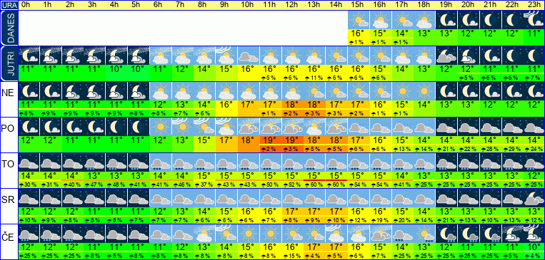 | Ura | 00h | 01h | 02h | 03h | 04h | 05h | 06h | 07h | 08h | 09h | 10h | 11h | 12h | 13h | 14h | 15h | 16h | 17h | 18h | 19h | 20h | 21h | 22h | 23h | |  |  |  |  |  |  |  |  |  |  |  |  |  |  |  |  |  |  |  |  |  |  |  |  | | Temperatura [C°] | 11°C | 11°C | 11°C | 10°C | 10°C | 10°C | 11°C | 12°C | 14°C | 15°C | 16°C | 16°C | 16°C | 16°C | 16°C | 16°C | 15°C | 14°C | 13°C | 12°C | 12°C | 11°C | 11°C | 11°C | | Občutek [C°] | 9°C | 9°C | 8°C | 8°C | 8°C | 8°C | 8°C | 9°C | 11°C | 13°C | 14°C | 14°C | 14°C | 14°C | 14°C | 13°C | 12°C | 11°C | 11°C | 10°C | 9°C | 9°C | 8°C | 8°C | | Možnost padavin | | | | | | | | | | | | 5 % | 6 % | 11 % | 6 % | 6 % | 6 % | | | | 5 % | 6 % | 6 % | 7 % | | Količina padavin [mm] | | | | | | | | | | | | | | | | | | | | | | | | | Sneg [cm] | | | | | | | | | | | | | | | | | | | | | | | | | | UV index | | | | | | | | | | UV 1 | UV 1 | UV 2 | UV 3 | UV 3 | UV 3 | UV 2 | UV 1 | UV 1 | | | | | | | | Hitrost vetra | 8 km/h | 8 km/h | 8 km/h | 9 km/h | 9 km/h | 10 km/h | 10 km/h | 10 km/h | 9 km/h | 10 km/h | 11 km/h | 13 km/h | 14 km/h | 15 km/h | 14 km/h | 14 km/h | 12 km/h | 11 km/h | 8 km/h | 9 km/h | 10 km/h | 11 km/h | 12 km/h | 13 km/h | Smer vetra | S | S | S | S | S | S | S | S | V | V | J | J | J | J | J | J | J | J | J | V | V | V | V | V | | Zračni tlak | 1015 | 1015 | 1015 | 1014 | 1014 | 1014 | 1013 | 1013 | 1013 | 1013 | 1012 | 1012 | 1011 | 1011 | 1010 | 1010 | 1009 | 1009 | 1010 | 1010 | 1010 | 1010 | 1010 | 1010 | | Vlaga | 76 % | 76 % | 78 % | 78 % | 78 % | 76 % | 74 % | 71 % | 68 % | 68 % | 70 % | 71 % | 71 % | 70 % | 68 % | 67 % | 68 % | 70 % | 73 % | 75 % | 75 % | 74 % | 72 % | 70 % |