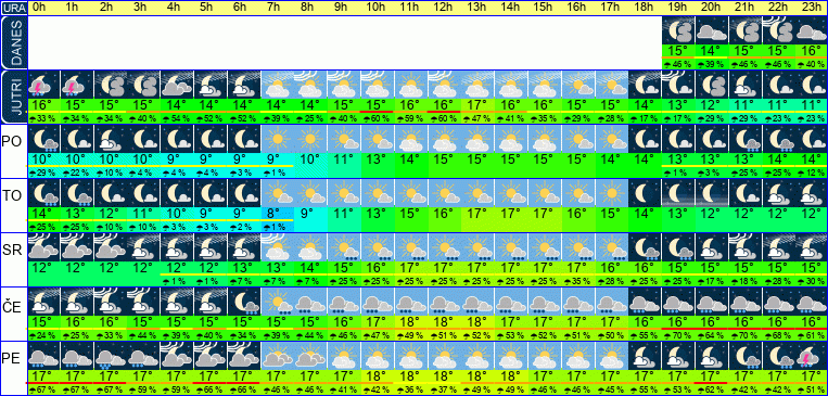 | Ura | 00h | 01h | 02h | 03h | 04h | 05h | 06h | 07h | 08h | 09h | 10h | 11h | 12h | 13h | 14h | 15h | 16h | 17h | 18h | 19h | 20h | 21h | 22h | 23h | |  |  |  |  |  |  |  |  |  |  |  |  |  |  |  |  |  |  |  |  |  |  |  |  | | Temperatura [C°] | 10°C | 10°C | 10°C | 9°C | 9°C | 9°C | 9°C | 9°C | 10°C | 11°C | 13°C | 14°C | 15°C | 15°C | 15°C | 15°C | 15°C | 14°C | 14°C | 13°C | 13°C | 13°C | 14°C | 14°C | | Občutek [C°] | 7°C | 6°C | 6°C | 5°C | 5°C | 5°C | 5°C | 5°C | 6°C | 8°C | 10°C | 12°C | 13°C | 13°C | 13°C | 13°C | 12°C | 11°C | 10°C | 10°C | 10°C | 11°C | 11°C | 11°C | | Možnost padavin | 28 % | 21 % | 10 % | 5 % | 5 % | 4 % | 3 % | 2 % | | | | | | 1 % | 1 % | 1 % | | | 1 % | 2 % | 3 % | 10 % | 11 % | 11 % | | Količina padavin [mm] | | | | | | | | | | | | | | | | | | | | | | | | | Sneg [cm] | | | | | | | | | | | | | | | | | | | | | | | | | | UV index | | | | | | | | | | | | UV 1 | UV 2 | UV 2 | UV 2 | UV 2 | UV 1 | UV 1 | | | | | | | | Hitrost vetra | 14 km/h | 15 km/h | 14 km/h | 14 km/h | 13 km/h | 12 km/h | 11 km/h | 10 km/h | 9 km/h | 8 km/h | 7 km/h | 6 km/h | 8 km/h | 10 km/h | 12 km/h | 12 km/h | 12 km/h | 11 km/h | 10 km/h | 10 km/h | 10 km/h | 11 km/h | 12 km/h | 12 km/h | Smer vetra | V | V | V | V | V | V | V | V | V | V | V | V | J | J | J | Z | Z | Z | J | J | J | J | J | Z | | Zračni tlak | 1006 | 1007 | 1007 | 1007 | 1008 | 1008 | 1008 | 1008 | 1009 | 1009 | 1009 | 1009 | 1009 | 1008 | 1008 | 1008 | 1007 | 1007 | 1007 | 1007 | 1007 | 1007 | 1007 | 1007 | | Vlaga | 87 % | 77 % | 74 % | 70 % | 71 % | 70 % | 71 % | 71 % | 68 % | 68 % | 67 % | 62 % | 65 % | 68 % | 70 % | 65 % | 58 % | 54 % | 55 % | 61 % | 67 % | 70 % | 73 % | 77 % |