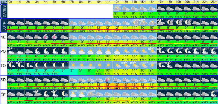 | Ura | 00h | 01h | 02h | 03h | 04h | 05h | 06h | 07h | 08h | 09h | 10h | 11h | 12h | 13h | 14h | 15h | 16h | 17h | 18h | 19h | 20h | 21h | 22h | 23h | |  |  |  |  |  |  |  |  |  |  |  |  |  |  |  |  |  |  |  |  |  |  |  |  | | Temperatura [C°] | 8°C | 9°C | 9°C | 9°C | 10°C | 10°C | 9°C | 9°C | 10°C | 11°C | 11°C | 12°C | 12°C | 12°C | 12°C | 11°C | 9°C | 8°C | 7°C | 7°C | 7°C | 7°C | 7°C | 6°C | | Občutek [C°] | 6°C | 6°C | 7°C | 7°C | 7°C | 7°C | 7°C | 7°C | 8°C | 9°C | 9°C | 10°C | 10°C | 10°C | 9°C | 9°C | 7°C | 6°C | 4°C | 4°C | 4°C | 4°C | 4°C | 4°C | | Možnost padavin | 42 % | 49 % | 80 % | 79 % | 79 % | 63 % | 56 % | 56 % | 63 % | 40 % | 55 % | 55 % | 56 % | 41 % | 46 % | 46 % | 46 % | 39 % | 39 % | 32 % | 39 % | 52 % | 39 % | 45 % | | Količina padavin [mm] | | | 1 mm | 2 mm | 1 mm | | | | | | | | | | 3 mm | 2 mm | | | | | | 1 mm | | | Sneg [cm] | | | | | | | | | | | | | | | | | | | | | | | | | | UV index | | | | | | | | | | | | UV 1 | UV 1 | UV 1 | UV 1 | UV 1 | | | | | | | | | | Hitrost vetra | 10 km/h | 11 km/h | 11 km/h | 11 km/h | 11 km/h | 10 km/h | 9 km/h | 8 km/h | 7 km/h | 7 km/h | 7 km/h | 7 km/h | 8 km/h | 8 km/h | 8 km/h | 7 km/h | 7 km/h | 7 km/h | 9 km/h | 10 km/h | 10 km/h | 10 km/h | 9 km/h | 8 km/h | Smer vetra | V | V | V | V | V | J | J | J | J | J | J | J | J | J | J | J | J | J | J | J | J | J | J | J | | Zračni tlak | 1004 | 1003 | 1003 | 1002 | 1002 | 1001 | 1001 | 1000 | 1000 | 1000 | 999 | 999 | 999 | 999 | 999 | 999 | 999 | 999 | 999 | 999 | 999 | 999 | 999 | 999 | | Vlaga | 95 % | 95 % | 91 % | 91 % | 89 % | 88 % | 86 % | 83 % | 81 % | 80 % | 75 % | 71 % | 68 % | 70 % | 71 % | 77 % | 85 % | 93 % | 93 % | 91 % | 92 % | 92 % | 93 % | 93 % |