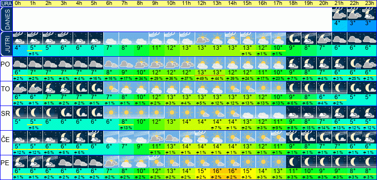 | Ura | 00h | 01h | 02h | 03h | 04h | 05h | 06h | 07h | 08h | 09h | 10h | 11h | 12h | 13h | 14h | 15h | 16h | 17h | 18h | 19h | 20h | 21h | 22h | 23h | |  |  |  |  |  |  |  |  |  |  |  |  |  |  |  |  |  |  |  |  |  |  |  |  | | Temperatura [C°] | 5°C | 5°C | 6°C | 6°C | 6°C | 6°C | 6°C | 8°C | 10°C | 12°C | 13°C | 14°C | 14°C | 14°C | 14°C | 13°C | 12°C | 11°C | 9°C | 8°C | 7°C | 6°C | 5°C | 5°C | | Občutek [C°] | 3°C | 3°C | 4°C | 4°C | 4°C | 4°C | 4°C | 6°C | 8°C | 11°C | 12°C | 13°C | 13°C | 13°C | 13°C | 12°C | 11°C | 9°C | 8°C | 6°C | 5°C | 4°C | 3°C | 3°C | | Možnost padavin | | 5 % | | | | | | 13 % | | | | | | 7 % | 1 % | 2 % | 3 % | 9 % | 8 % | 15 % | 14 % | 13 % | 12 % | 12 % | | Količina padavin [mm] | | | | | | | | | | | | | | | | | | | | | | | | | Sneg [cm] | | | | | | | | | | | | | | | | | | | | | | | | | | UV index | | | | | | | | | | | UV 1 | UV 1 | UV 2 | UV 2 | UV 2 | UV 1 | UV 1 | | | | | | | | | Hitrost vetra | 6 km/h | 5 km/h | 5 km/h | 5 km/h | 4 km/h | 4 km/h | 5 km/h | 5 km/h | 4 km/h | 4 km/h | 4 km/h | 4 km/h | 4 km/h | 5 km/h | 5 km/h | 5 km/h | 5 km/h | 5 km/h | 4 km/h | 3 km/h | 4 km/h | 4 km/h | 4 km/h | 5 km/h | Smer vetra | S | S | S | S | V | S | S | S | S | Z | Z | Z | Z | Z | Z | Z | Z | Z | S | S | S | S | S | S | | Zračni tlak | 1027 | 1027 | 1027 | 1027 | 1027 | 1027 | 1027 | 1027 | 1027 | 1027 | 1028 | 1027 | 1027 | 1027 | 1026 | 1026 | 1026 | 1026 | 1026 | 1026 | 1026 | 1026 | 1026 | 1025 | | Vlaga | 100 % | 100 % | 100 % | 100 % | 100 % | 99 % | 96 % | 91 % | 88 % | 81 % | 74 % | 73 % | 73 % | 74 % | 75 % | 77 % | 82 % | 90 % | 96 % | 100 % | 100 % | 100 % | 100 % | 100 % |