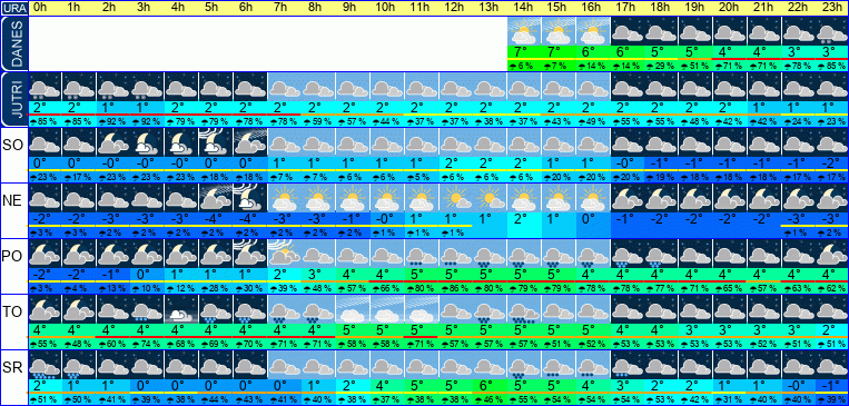 | Ura | 00h | 01h | 02h | 03h | 04h | 05h | 06h | 07h | 08h | 09h | 10h | 11h | 12h | 13h | 14h | 15h | 16h | 17h | 18h | 19h | 20h | 21h | 22h | 23h | |  |  |  |  |  |  |  |  |  |  |  |  |  |  |  |  |  |  |  |  |  |  |  |  | | Temperatura [C°] | -2°C | -2°C | -1°C | 0°C | 1°C | 1°C | 1°C | 2°C | 3°C | 4°C | 4°C | 5°C | 5°C | 5°C | 5°C | 5°C | 4°C | 4°C | 4°C | 4°C | 4°C | 4°C | 4°C | 4°C | | Občutek [C°] | -6°C | -5°C | -4°C | -4°C | -3°C | -2°C | -1°C | -0°C | 0°C | 0°C | 1°C | 2°C | 3°C | 3°C | 3°C | 3°C | 2°C | 2°C | 2°C | 1°C | 1°C | 1°C | 1°C | 1°C | | Možnost padavin | 3 % | 4 % | 13 % | 10 % | 13 % | 28 % | 30 % | 39 % | 48 % | 57 % | 66 % | 80 % | 86 % | 80 % | 79 % | 79 % | 78 % | 78 % | 77 % | 71 % | 65 % | 57 % | 64 % | 63 % | | Količina padavin [mm] | | | | | | | | | | | | 2 mm | 2 mm | 3 mm | 3 mm | 3 mm | 3 mm | 3 mm | 3 mm | | | | | | Sneg [cm] | | | | | | | | | | | | | | | | | | | | | | | | | | UV index | | | | | | | | | | | | | UV 1 | UV 1 | | | | | | | | | | | | Hitrost vetra | 5 km/h | 5 km/h | 5 km/h | 6 km/h | 6 km/h | 5 km/h | 2 km/h | 2 km/h | 4 km/h | 7 km/h | 9 km/h | 7 km/h | 3 km/h | 2 km/h | 2 km/h | 3 km/h | 4 km/h | 2 km/h | 3 km/h | 6 km/h | 6 km/h | 6 km/h | 6 km/h | 5 km/h | Smer vetra | Z | Z | S | S | S | S | S | S | Z | Z | Z | Z | S | S | S | S | S | S | Z | Z | Z | J | J | J | | Zračni tlak | 1014 | 1014 | 1013 | 1013 | 1012 | 1012 | 1011 | 1010 | 1010 | 1009 | 1008 | 1007 | 1006 | 1005 | 1005 | 1004 | 1003 | 1003 | 1003 | 1003 | 1003 | 1003 | 1002 | 1002 | | Vlaga | 80 % | 77 % | 73 % | 75 % | 75 % | 77 % | 80 % | 83 % | 87 % | 87 % | 88 % | 89 % | 91 % | 96 % | 93 % | 92 % | 88 % | 89 % | 87 % | 84 % | 83 % | 84 % | 82 % | 82 % |