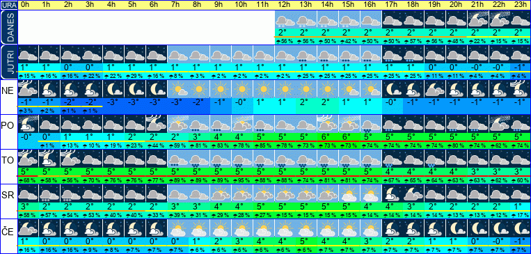| Temperatura: | 1°C / 2°C / 3°C (+-1°C) | Možnost padavin: | 59 % | Hitrost vetra: | 4 / 7 / 11 km/h (+-3) | Skupna oblačnost: | 78 / 92 / 100 % (+-2) |