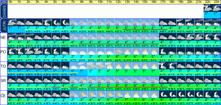 | Temperatura: | 1°C / 3°C / 5°C (+-1°C) | Možnost padavin: | 25 % | Hitrost vetra: | 0 / 6 / 14 km/h (+-5) | Skupna oblačnost: | 52 / 84 / 98 % (+-39) |