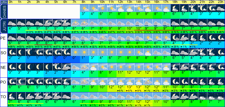 | Ura | 00h | 01h | 02h | 03h | 04h | 05h | 06h | 07h | 08h | 09h | 10h | 11h | 12h | 13h | 14h | 15h | 16h | 17h | 18h | 19h | 20h | 21h | 22h | 23h | |  |  |  |  |  |  |  |  |  |  |  |  |  |  |  |  |  |  |  |  |  |  |  |  | | Temperatura [C°] | 4°C | 5°C | 5°C | 5°C | 5°C | 5°C | 5°C | 6°C | 6°C | 7°C | 8°C | 9°C | 9°C | 10°C | 10°C | 9°C | 9°C | 9°C | 8°C | 7°C | 7°C | 7°C | 7°C | 7°C | | Občutek [C°] | 2°C | 3°C | 3°C | 3°C | 3°C | 3°C | 4°C | 4°C | 4°C | 6°C | 7°C | 7°C | 8°C | 8°C | 9°C | 8°C | 7°C | 7°C | 6°C | 6°C | 5°C | 5°C | 5°C | 4°C | | Možnost padavin | | | 13 % | 25 % | 47 % | 42 % | 36 % | 37 % | 38 % | 38 % | 46 % | 47 % | 42 % | 55 % | 61 % | 74 % | 80 % | 68 % | 74 % | 69 % | 61 % | 60 % | 53 % | 46 % | | Količina padavin [mm] | | | | | | | | | | | | | | | | 1 mm | 2 mm | 3 mm | 3 mm | 4 mm | 3 mm | 1 mm | | | Sneg [cm] | | | | | | | | | | | | | | | | | | | | | | | | | | UV index | | | | | | | | | | | | | UV 1 | UV 1 | UV 1 | | | | | | | | | | | Hitrost vetra | 1 km/h | 2 km/h | 0 km/h | 1 km/h | 2 km/h | 1 km/h | 1 km/h | 1 km/h | 2 km/h | 1 km/h | 1 km/h | 2 km/h | 2 km/h | 2 km/h | 1 km/h | 1 km/h | 3 km/h | 3 km/h | 6 km/h | 2 km/h | 2 km/h | 3 km/h | 5 km/h | 8 km/h | Smer vetra | J | J | V | V | V | S | V | Z | Z | Z | Z | Z | Z | J | S | J | V | Z | V | Z | S | S | V | V | | Zračni tlak | 1012 | 1012 | 1011 | 1010 | 1009 | 1008 | 1007 | 1007 | 1006 | 1006 | 1005 | 1004 | 1003 | 1002 | 1002 | 1001 | 1001 | 1001 | 1001 | 1002 | 1002 | 1003 | 1003 | 1004 | | Vlaga | 77 % | 75 % | 75 % | 78 % | 80 % | 83 % | 85 % | 86 % | 87 % | 86 % | 85 % | 82 % | 79 % | 78 % | 80 % | 79 % | 81 % | 83 % | 85 % | 86 % | 88 % | 88 % | 87 % | 89 % |
