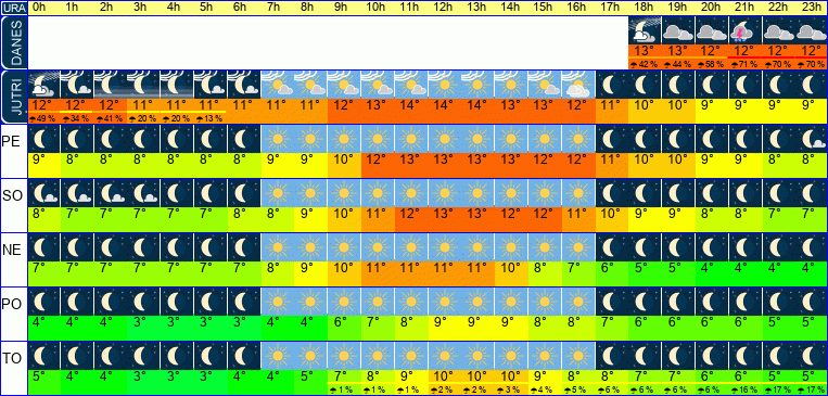 | Ura | 14h | 15h | 16h | 17h | 18h | 19h | 20h | 21h | 22h | 23h | | | | | | | | | | | | | | | |  |  |  |  |  |  |  |  |  |  | | Temperatura [C°] | 13°C | 12°C | 12°C | 12°C | 12°C | 12°C | 12°C | 12°C | 12°C | 12°C | | Občutek [C°] | 10°C | 9°C | 9°C | 9°C | 9°C | 9°C | 9°C | 9°C | 9°C | 9°C | | Možnost padavin | 78 % | 64 % | 56 % | 50 % | 43 % | 44 % | 58 % | 71 % | 70 % | 69 % | | Količina padavin [mm] | | | | | | | 1 mm | | | | Sneg [cm] | | | | | | | | | | | | UV index | | | | | | | | | | | | Hitrost vetra | 15 km/h | 15 km/h | 15 km/h | 15 km/h | 15 km/h | 15 km/h | 16 km/h | 16 km/h | 15 km/h | 15 km/h | Smer vetra | V | V | V | V | V | V | V | V | V | V | | Zračni tlak | 1010 | 1011 | 1011 | 1012 | 1012 | 1013 | 1013 | 1014 | 1014 | 1015 | | Vlaga | 82 % | 84 % | 86 % | 86 % | 85 % | 85 % | 85 % | 85 % | 85 % | 84 % |