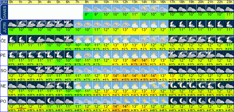 | Ura | 00h | 01h | 02h | 03h | 04h | 05h | 06h | 07h | 08h | 09h | 10h | 11h | 12h | 13h | 14h | 15h | 16h | 17h | 18h | 19h | 20h | 21h | 22h | 23h | |  |  |  |  |  |  |  |  |  |  |  |  |  |  |  |  |  |  |  |  |  |  |  |  | | Temperatura [C°] | 11°C | 11°C | 10°C | 10°C | 10°C | 10°C | 10°C | 10°C | 11°C | 12°C | 12°C | 13°C | 13°C | 13°C | 13°C | 13°C | 12°C | 12°C | 11°C | 11°C | 11°C | 11°C | 11°C | 11°C | | Občutek [C°] | 8°C | 7°C | 7°C | 7°C | 7°C | 6°C | 6°C | 6°C | 7°C | 8°C | 8°C | 9°C | 9°C | 9°C | 8°C | 8°C | 7°C | 7°C | 7°C | 7°C | 7°C | 7°C | 6°C | 6°C | | Možnost padavin | 41 % | 41 % | 42 % | 35 % | 35 % | 35 % | 35 % | 35 % | 34 % | 34 % | 34 % | 28 % | 28 % | 29 % | 23 % | 25 % | 25 % | 26 % | 26 % | 27 % | 35 % | 33 % | 22 % | 22 % | | Količina padavin [mm] | | | | | | | | | | | | | | | | | | | | | | | | | Sneg [cm] | | | | | | | | | | | | | | | | | | | | | | | | | | UV index | | | | | | | | | | | | | | | | | | | | | | | | | | Hitrost vetra | 11 km/h | 11 km/h | 12 km/h | 13 km/h | 13 km/h | 13 km/h | 13 km/h | 14 km/h | 14 km/h | 15 km/h | 16 km/h | 17 km/h | 18 km/h | 18 km/h | 19 km/h | 19 km/h | 19 km/h | 18 km/h | 17 km/h | 17 km/h | 17 km/h | 16 km/h | 16 km/h | 16 km/h | Smer vetra | V | V | V | V | V | V | V | V | V | V | V | V | V | V | V | V | V | V | V | V | V | V | V | V | | Zračni tlak | 1024 | 1024 | 1024 | 1023 | 1023 | 1023 | 1023 | 1023 | 1023 | 1023 | 1023 | 1023 | 1023 | 1022 | 1022 | 1022 | 1022 | 1022 | 1022 | 1022 | 1022 | 1021 | 1021 | 1021 | | Vlaga | 75 % | 75 % | 73 % | 72 % | 72 % | 72 % | 73 % | 74 % | 72 % | 69 % | 66 % | 64 % | 63 % | 62 % | 62 % | 63 % | 64 % | 64 % | 65 % | 65 % | 65 % | 64 % | 64 % | 65 % |