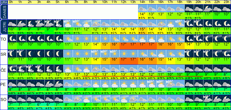 | Ura | 13h | 14h | 15h | 16h | 17h | 18h | 19h | 20h | 21h | 22h | 23h | | | | | | | | | | | | | | |  |  |  |  |  |  |  |  |  |  |  | | Temperatura [C°] | 14°C | 14°C | 13°C | 13°C | 12°C | 12°C | 11°C | 11°C | 11°C | 10°C | 10°C | | Občutek [C°] | 11°C | 11°C | 11°C | 10°C | 10°C | 10°C | 9°C | 9°C | 9°C | 8°C | 8°C | | Možnost padavin | 8 % | 5 % | 1 % | | | | 1 % | 1 % | | | | | Količina padavin [mm] | | | | | | | | | | | | Sneg [cm] | | | | | | | | | | | | | UV index | UV 2 | UV 2 | UV 2 | UV 1 | | | | | | | | | Hitrost vetra | 8 km/h | 7 km/h | 6 km/h | 5 km/h | 5 km/h | 4 km/h | 4 km/h | 3 km/h | 4 km/h | 4 km/h | 4 km/h | Smer vetra | J | J | V | J | V | V | V | S | S | S | S | | Zračni tlak | 1013 | 1012 | 1012 | 1012 | 1012 | 1012 | 1012 | 1012 | 1012 | 1013 | 1013 | | Vlaga | 49 % | 49 % | 54 % | 57 % | 58 % | 60 % | 61 % | 61 % | 63 % | 64 % | 68 % |