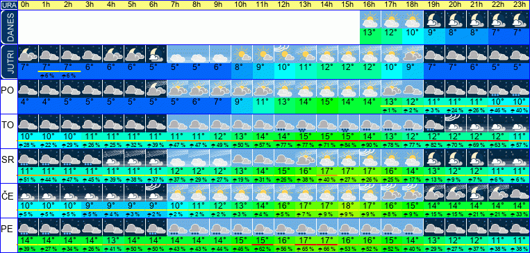 Ura | 13h | 14h | 15h | 16h | 17h | 18h | 19h | 20h | 21h | 22h | 23h | | | | | | | | | | | | | | |  |  |  |  |  |  |  |  |  |  |  | Temperatura [C°] | 11°C | 12°C | 12°C | 12°C | 11°C | 9°C | 8°C | 8°C | 7°C | 7°C | 7°C | Občutek [C°] | 9°C | 10°C | 10°C | 10°C | 9°C | 7°C | 6°C | 5°C | 5°C | 5°C | 5°C | Možnost padavin | | | | | | | | | | | | Količina padavin [mm] | | | | | | | | | | | | Sneg [cm] | | | | | | | | | | | | UV index | UV 2 | UV 3 | UV 2 | UV 1 | | | | | | | | Hitrost vetra | 5 km/h | 6 km/h | 6 km/h | 6 km/h | 6 km/h | 6 km/h | 6 km/h | 5 km/h | 6 km/h | 8 km/h | 7 km/h | Smer vetra | Z | Z | Z | Z | S | V | V | V | V | V | V | Zračni tlak | 1023 | 1023 | 1023 | 1022 | 1022 | 1023 | 1024 | 1024 | 1025 | 1026 | 1026 | Vlaga | 73 % | 72 % | 73 % | 75 % | 80 % | 72 % | 77 % | 85 % | 85 % | 83 % | 90 % |