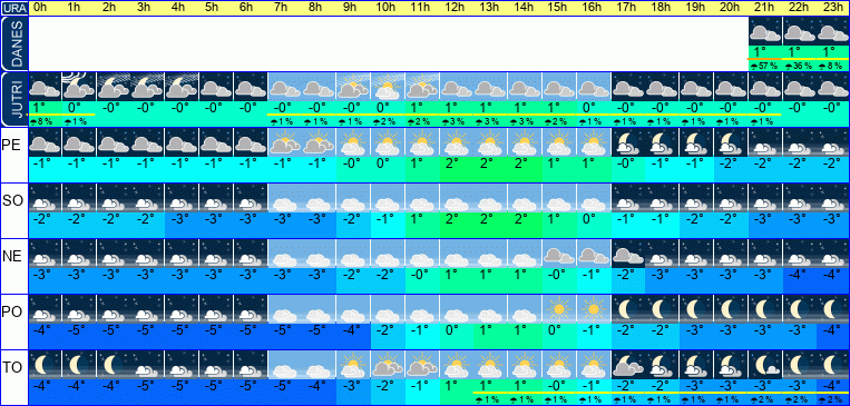 | Ura | 19h | 20h | 21h | 22h | 23h | | | | | | | | | | | | | | | | | | | | |  |  |  |  |  | | Temperatura [C°] | 2°C | 1°C | 1°C | 1°C | 1°C | | Občutek [C°] | -3°C | -2°C | -3°C | -3°C | -3°C | | Možnost padavin | 62 % | 62 % | 35 % | 8 % | 1 % | | Količina padavin [mm] | | | | | | Sneg [cm] | | | | | | | UV index | | | | | | | Hitrost vetra | 11 km/h | 10 km/h | 10 km/h | 9 km/h | 9 km/h | Smer vetra | V | S | S | S | S | | Zračni tlak | 1021 | 1022 | 1023 | 1023 | 1024 | | Vlaga | 91 % | 95 % | 96 % | 97 % | 97 % |