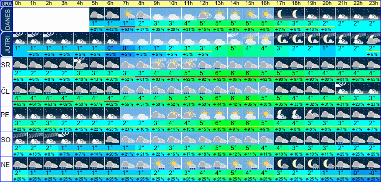 | Ura | 04h | 05h | 06h | 07h | 08h | 09h | 10h | 11h | 12h | 13h | 14h | 15h | 16h | 17h | 18h | 19h | 20h | 21h | 22h | 23h | | | | | |  |  |  |  |  |  |  |  |  |  |  |  |  |  |  |  |  |  |  |  | | Temperatura [C°] | 1°C | 1°C | 1°C | 1°C | 2°C | 2°C | 3°C | 4°C | 5°C | 5°C | 5°C | 5°C | 4°C | 4°C | 3°C | 2°C | 2°C | 2°C | 1°C | 1°C | | Občutek [C°] | -2°C | -2°C | -1°C | -1°C | -1°C | -0°C | 1°C | 2°C | 2°C | 3°C | 3°C | 3°C | 3°C | 2°C | 1°C | -0°C | -1°C | -1°C | -1°C | -2°C | | Možnost padavin | 7 % | 21 % | 43 % | 63 % | 57 % | 35 % | 29 % | 22 % | 16 % | 9 % | 8 % | 8 % | 8 % | 7 % | 6 % | 12 % | 6 % | | | | | Količina padavin [mm] | | | | 1 mm | | | | | | | | | | | | | | | | | Sneg [cm] | | | | | | | | | | | | | | | | | | | | | | UV index | | | | | | | | | UV 1 | UV 1 | UV 1 | UV 1 | | | | | | | | | | Hitrost vetra | 2 km/h | 2 km/h | 2 km/h | 3 km/h | 3 km/h | 3 km/h | 3 km/h | 3 km/h | 3 km/h | 3 km/h | 3 km/h | 3 km/h | 2 km/h | 3 km/h | 2 km/h | 2 km/h | 2 km/h | 2 km/h | 2 km/h | 2 km/h | Smer vetra | S | S | J | Z | S | Z | J | J | J | J | J | J | S | S | V | V | S | S | S | V | | Zračni tlak | 999 | 999 | 1000 | 1000 | 1000 | 1001 | 1001 | 1001 | 1001 | 1001 | 1002 | 1002 | 1003 | 1003 | 1004 | 1005 | 1005 | 1006 | 1006 | 1007 | | Vlaga | 91 % | 92 % | 91 % | 91 % | 91 % | 89 % | 89 % | 89 % | 90 % | 88 % | 89 % | 91 % | 95 % | 94 % | 90 % | 84 % | 86 % | 89 % | 84 % | 86 % |