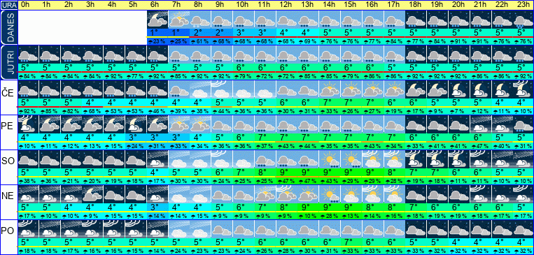 | Ura | 05h | 06h | 07h | 08h | 09h | 10h | 11h | 12h | 13h | 14h | 15h | 16h | 17h | 18h | 19h | 20h | 21h | 22h | 23h | | | | | | |  |  |  |  |  |  |  |  |  |  |  |  |  |  |  |  |  |  |  | | Temperatura [C°] | 1°C | 1°C | 1°C | 2°C | 2°C | 3°C | 3°C | 4°C | 4°C | 5°C | 5°C | 5°C | 5°C | 5°C | 5°C | 5°C | 5°C | 5°C | 5°C | | Občutek [C°] | -2°C | -2°C | -1°C | -1°C | -0°C | 0°C | 1°C | 1°C | 2°C | 2°C | 2°C | 2°C | 2°C | 3°C | 3°C | 3°C | 3°C | 3°C | 3°C | | Možnost padavin | 45 % | 23 % | 25 % | 61 % | 68 % | 68 % | 68 % | 68 % | 69 % | 76 % | 76 % | 77 % | 84 % | 77 % | 84 % | 91 % | 91 % | 76 % | 76 % | | Količina padavin [mm] | | | | | | | | | | 1 mm | | 1 mm | 1 mm | 1 mm | 2 mm | 1 mm | 1 mm | 2 mm | 3 mm | Sneg [cm] | | | | 0 cm | | | | | | | | | | | | | | | | | UV index | | | | | | | | | UV 1 | UV 1 | | | | | | | | | | | Hitrost vetra | 3 km/h | 3 km/h | 3 km/h | 3 km/h | 3 km/h | 3 km/h | 3 km/h | 4 km/h | 4 km/h | 5 km/h | 5 km/h | 6 km/h | 6 km/h | 5 km/h | 5 km/h | 5 km/h | 4 km/h | 4 km/h | 4 km/h | Smer vetra | J | J | V | J | J | J | J | J | J | Z | J | J | Z | V | S | V | Z | V | V | | Zračni tlak | 1010 | 1009 | 1009 | 1009 | 1009 | 1010 | 1009 | 1008 | 1008 | 1008 | 1008 | 1008 | 1008 | 1008 | 1008 | 1008 | 1008 | 1008 | 1008 | | Vlaga | 93 % | 94 % | 93 % | 92 % | 92 % | 91 % | 91 % | 90 % | 91 % | 89 % | 92 % | 93 % | 91 % | 91 % | 90 % | 89 % | 88 % | 89 % | 93 % |