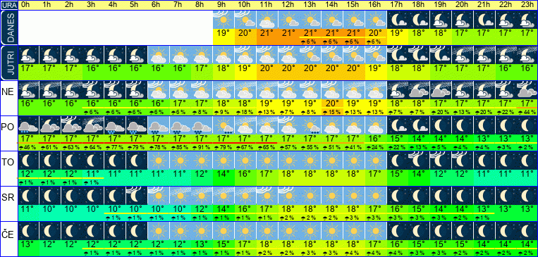 | | Ura | 00h | 01h | 02h | 03h | 04h | 05h | 06h | 07h | 08h | 09h | 10h | 11h | 12h | 13h | 14h | 15h | 16h | 17h | 18h | 19h | 20h | 21h | 22h | 23h |  |  |  |  |  |  |  |  |  |  |  |  |  |  |  |  |  |  |  |  |  |  |  |  |  |  |  | Temperatura [C°] | 16°C | 16°C | 16°C | 16°C | 16°C | 16°C | 16°C | 17°C | 17°C | 18°C | 18°C | 19°C | 19°C | 19°C | 20°C | 19°C | 19°C | 18°C | 18°C | 17°C | 17°C | 17°C | 17°C | 17°C |  | Občutek [C°] | 17°C | 17°C | 16°C | 16°C | 16°C | 16°C | 16°C | 16°C | 16°C | 16°C | 16°C | 16°C | 17°C | 17°C | 17°C | 17°C | 17°C | 16°C | 16°C | 15°C | 15°C | 14°C | 14°C | 14°C |  | Možnost padavin |  |  |  | 6 % | 6 % | 6 % | 6 % | 6 % | 8 % | 10 % | 18 % | 13 % | 8 % | 9 % | 16 % | 14 % | 13 % | 8 % | 8 % | 20 % | 14 % | 20 % | 22 % | 45 % |  | Količina padavin [mm] |  |  |  |  |  |  |  |  |  |  |  |  |  |  |  |  |  |  |  |  |  |  |  |  |  Sneg [cm] |  |  |  |  |  |  |  |  |  |  |  |  |  |  |  |  |  |  |  |  |  |  |  |  | | UV index |  |  |  |  |  |  |  |  |  |  | UV 1 | UV 2 | UV 2 | UV 2 | UV 1 | UV 1 |  |  |  |  |  |  |  |  |  | Hitrost vetra | 6 km/h | 5 km/h | 6 km/h | 8 km/h | 9 km/h | 10 km/h | 11 km/h | 12 km/h | 14 km/h | 16 km/h | 18 km/h | 20 km/h | 21 km/h | 21 km/h | 20 km/h | 19 km/h | 18 km/h | 16 km/h | 16 km/h | 16 km/h | 17 km/h | 19 km/h | 20 km/h | 19 km/h |  Smer vetra | V | J | V | V | V | J | J | J | J | J | J | J | J | J | J | J | J | J | J | J | J | J | J | V | | Zračni tlak | 1021 | 1020 | 1020 | 1020 | 1019 | 1019 | 1019 | 1019 | 1019 | 1018 | 1018 | 1018 | 1017 | 1017 | 1016 | 1016 | 1016 | 1016 | 1016 | 1016 | 1016 | 1016 | 1015 | 1015 |  | Vlaga | 88 % | 89 % | 85 % | 85 % | 86 % | 86 % | 85 % | 84 % | 81 % | 79 % | 76 % | 74 % | 72 % | 70 % | 72 % | 73 % | 75 % | 79 % | 81 % | 83 % | 82 % | 79 % | 77 % | 78 % |