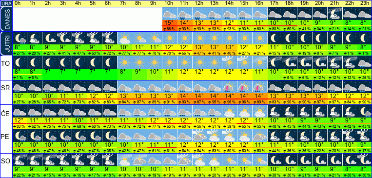 | Ura | 09h | 10h | 11h | 12h | 13h | 14h | 15h | 16h | 17h | 18h | 19h | 20h | 21h | 22h | 23h | | | | | | | | | | |  |  |  |  |  |  |  |  |  |  |  |  |  |  |  | | Temperatura [C°] | 15°C | 15°C | 14°C | 13°C | 13°C | 12°C | 11°C | 11°C | 10°C | 10°C | 10°C | 9°C | 9°C | 8°C | 8°C | | Občutek [C°] | 10°C | 10°C | 9°C | 8°C | 8°C | 8°C | 8°C | 7°C | 8°C | 7°C | 7°C | 7°C | 6°C | 6°C | 5°C | | Možnost padavin | 93 % | 86 % | 93 % | 93 % | 93 % | 93 % | 93 % | 80 % | 80 % | 60 % | 41 % | 34 % | 21 % | 14 % | 21 % | | Količina padavin [mm] | | | 4 mm | 4 mm | 2 mm | 2 mm | | | | | | | | | | Sneg [cm] | | | | | | | | | | | | | | | | | UV index | | | | | | | | | | | | | | | | | Hitrost vetra | 25 km/h | 28 km/h | 28 km/h | 25 km/h | 21 km/h | 18 km/h | 13 km/h | 11 km/h | 8 km/h | 6 km/h | 5 km/h | 6 km/h | 7 km/h | 8 km/h | 9 km/h | Smer vetra | V | V | V | V | Z | Z | Z | Z | Z | Z | Z | Z | Z | V | V | | Zračni tlak | 999 | 998 | 998 | 998 | 998 | 998 | 999 | 999 | 999 | 999 | 999 | 999 | 999 | 999 | 999 | | Vlaga | 73 % | 75 % | 77 % | 78 % | 76 % | 75 % | 75 % | 68 % | 67 % | 67 % | 66 % | 68 % | 71 % | 78 % | 80 % |