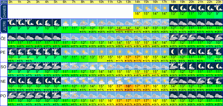 | Ura | 00h | 01h | 02h | 03h | 04h | 05h | 06h | 07h | 08h | 09h | 10h | 11h | 12h | 13h | 14h | 15h | 16h | 17h | 18h | 19h | 20h | 21h | 22h | 23h | |  |  |  |  |  |  |  |  |  |  |  |  |  |  |  |  |  |  |  |  |  |  |  |  | | Temperatura [C°] | 11°C | 11°C | 10°C | 10°C | 10°C | 10°C | 11°C | 12°C | 13°C | 14°C | 16°C | 16°C | 17°C | 18°C | 18°C | 17°C | 16°C | 15°C | 14°C | 13°C | 13°C | 12°C | 12°C | 11°C | | Občutek [C°] | 7°C | 7°C | 7°C | 7°C | 7°C | 7°C | 8°C | 9°C | 10°C | 11°C | 12°C | 13°C | 14°C | 15°C | 14°C | 14°C | 13°C | 12°C | 11°C | 11°C | 10°C | 9°C | 8°C | 8°C | | Možnost padavin | 11 % | 11 % | 10 % | 9 % | 14 % | 7 % | 5 % | 5 % | 5 % | 11 % | 7 % | 16 % | 14 % | 24 % | 27 % | 29 % | 30 % | 25 % | 26 % | 25 % | 22 % | 18 % | 14 % | 10 % | | Količina padavin [mm] | | | | | | | | | | | | | | | | | | | | | | | | | Sneg [cm] | | | | | | | | | | | | | | | | | | | | | | | | | | UV index | | | | | | | | | | | UV 1 | UV 2 | UV 2 | UV 3 | UV 2 | UV 2 | UV 1 | | | | | | | | | Hitrost vetra | 13 km/h | 13 km/h | 13 km/h | 13 km/h | 12 km/h | 12 km/h | 13 km/h | 13 km/h | 14 km/h | 14 km/h | 13 km/h | 13 km/h | 12 km/h | 12 km/h | 13 km/h | 13 km/h | 12 km/h | 12 km/h | 11 km/h | 10 km/h | 10 km/h | 10 km/h | 10 km/h | 10 km/h | Smer vetra | V | V | V | V | V | V | V | V | V | J | J | J | J | Z | Z | Z | Z | Z | Z | S | S | S | S | V | | Zračni tlak | 1012 | 1012 | 1012 | 1012 | 1013 | 1013 | 1014 | 1014 | 1014 | 1014 | 1014 | 1014 | 1014 | 1014 | 1014 | 1014 | 1014 | 1014 | 1015 | 1015 | 1016 | 1016 | 1016 | 1016 | | Vlaga | 76 % | 77 % | 78 % | 79 % | 80 % | 78 % | 76 % | 72 % | 68 % | 63 % | 58 % | 54 % | 51 % | 49 % | 49 % | 50 % | 53 % | 56 % | 60 % | 63 % | 65 % | 66 % | 67 % | 67 % |