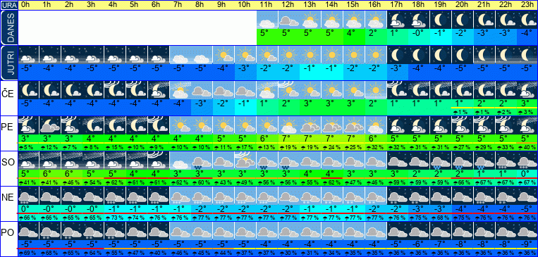 | Ura | 00h | 01h | 02h | 03h | 04h | 05h | 06h | 07h | 08h | 09h | 10h | 11h | 12h | 13h | 14h | 15h | 16h | 17h | 18h | 19h | 20h | 21h | 22h | 23h | |  |  |  |  |  |  |  |  |  |  |  |  |  |  |  |  |  |  |  |  |  |  |  |  | | Temperatura [C°] | -5°C | -5°C | -6°C | -6°C | -6°C | -6°C | -6°C | -6°C | -6°C | -5°C | -5°C | -5°C | -5°C | -4°C | -4°C | -4°C | -4°C | -4°C | -5°C | -5°C | -6°C | -6°C | -7°C | -7°C | | Občutek [C°] | -8°C | -9°C | -10°C | -10°C | -10°C | -10°C | -10°C | -10°C | -9°C | -9°C | -9°C | -8°C | -8°C | -8°C | -7°C | -7°C | -7°C | -8°C | -8°C | -9°C | -9°C | -10°C | -10°C | -10°C | | Možnost padavin | 67 % | 66 % | 69 % | 68 % | 57 % | 56 % | 55 % | 54 % | 53 % | 53 % | 52 % | 52 % | 53 % | 53 % | 54 % | 55 % | 55 % | 56 % | 36 % | 36 % | 36 % | 36 % | 36 % | 36 % | | Količina padavin [mm] | | | | | | | | | 1 mm | 1 mm | 1 mm | | | | 1 mm | 1 mm | | | | | | | | | Sneg [cm] | | | | | | | | 0 cm | 0.8 cm | 0 cm | 0 cm | 0 cm | | | 0.8 cm | 0.8 cm | | | | | | | | | | UV index | | | | | | | | | | | | | UV 1 | UV 1 | UV 1 | | | | | | | | | | | Hitrost vetra | 4 km/h | 4 km/h | 4 km/h | 4 km/h | 5 km/h | 5 km/h | 4 km/h | 4 km/h | 3 km/h | 3 km/h | 4 km/h | 4 km/h | 4 km/h | 4 km/h | 4 km/h | 4 km/h | 4 km/h | 4 km/h | 4 km/h | 4 km/h | 4 km/h | 4 km/h | 3 km/h | 3 km/h | Smer vetra | S | S | S | Z | S | S | S | S | S | S | S | V | V | S | S | S | S | S | S | S | V | V | V | V | | Zračni tlak | 1013 | 1014 | 1014 | 1014 | 1014 | 1014 | 1015 | 1015 | 1016 | 1016 | 1017 | 1016 | 1016 | 1016 | 1016 | 1016 | 1016 | 1017 | 1017 | 1018 | 1018 | 1018 | 1019 | 1019 | | Vlaga | 100 % | 100 % | 100 % | 100 % | 97 % | 96 % | 95 % | 94 % | 93 % | 91 % | 91 % | 92 % | 96 % | 94 % | 100 % | 100 % | 100 % | 100 % | 100 % | 100 % | 100 % | 100 % | 100 % | 100 % |